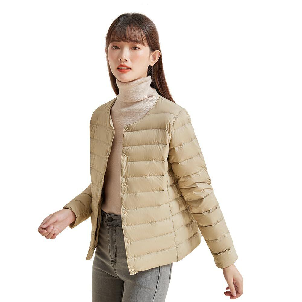 「この『【新着商品】Moilyuko ウルトラライト ダウンジャケット レディース』は、軽量でありながらも抜群の暖かさを誇るアイテムです!ノーカラーのデザインは洗練されており、さまざまなコーディネートにフィットします。」