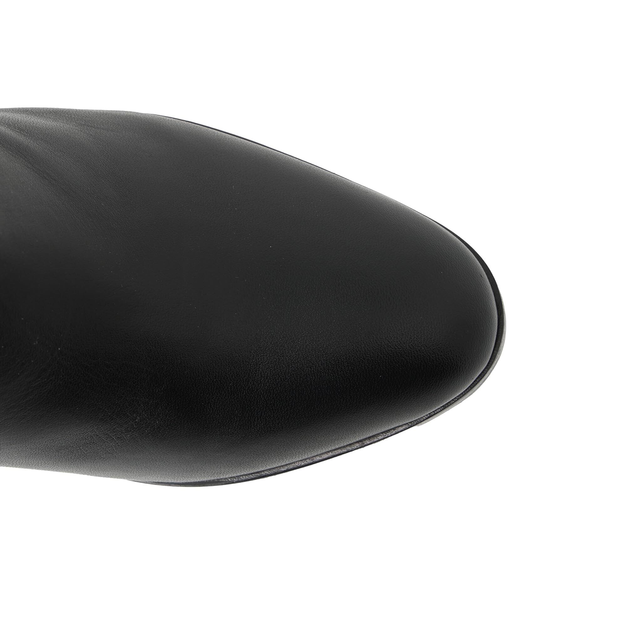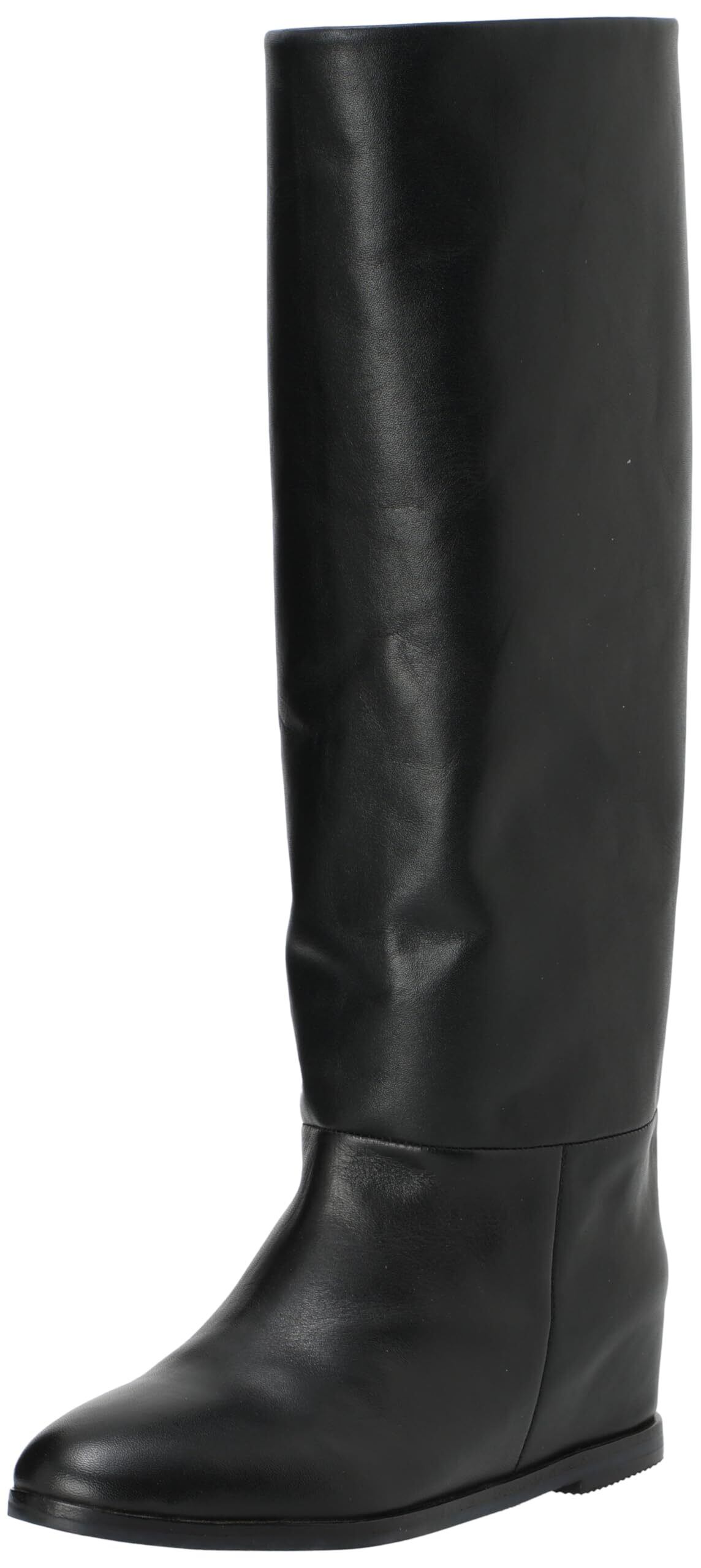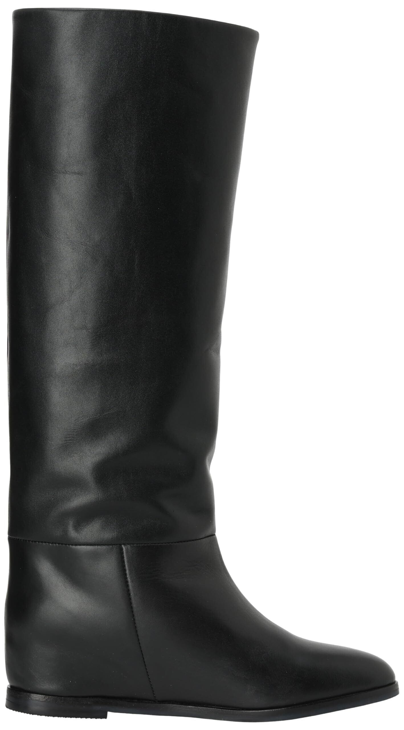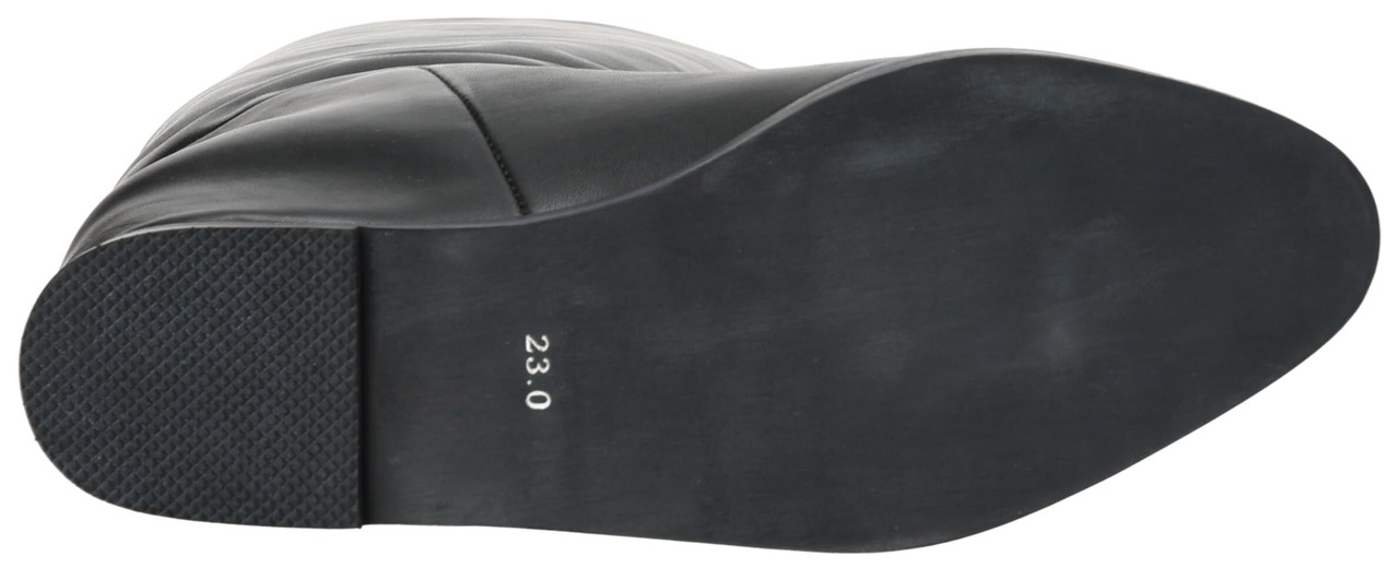 しっかりと膝まである長めタイプ。ゆったりとした筒幅でルーズなシルエットがトレンドのブーツ。素材は牛革で高級感もあります。あえてダボっと履くのが今っぽいシルエット。インヒールも約3㎝あるので美脚効果もあります。ファスナーは付いていないですが、太めの筒幅なので足はすっと入ります。