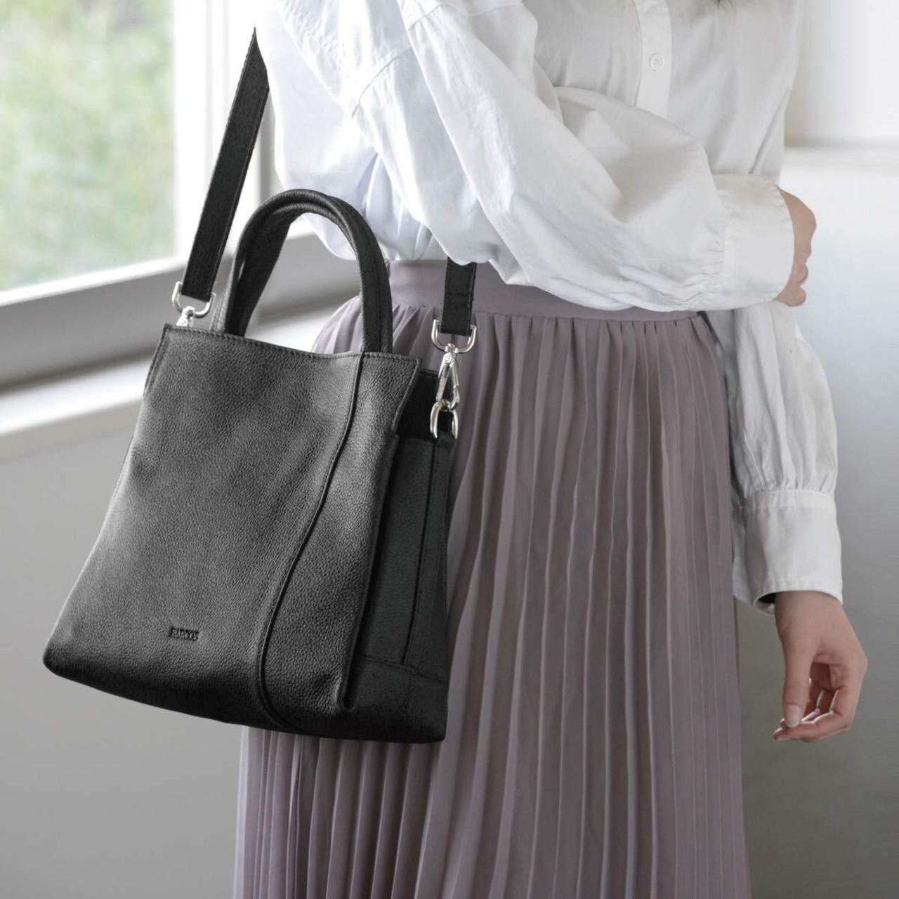 大人気のレザーハンドバッグがリニューアル。 素材が新しくなり、マットな質感のレザーで高級感がさらにアップ。 お財布、携帯、ハンカチなど必要最低限のもの、プラス、もう少し収納したいときに便利なサイズのリアルレザーハンドバッグです。 単行本や手帳、少し大きめのお化粧ポーチなど、ポシェットには収まりきらないけど、トートバッグ程大きい荷物は持ち歩きたくない、そんな日にジャストフィットなサイズ感です。 脱着式のロングショルダーをつけると、斜め掛けしにてお使いいただけ、両手をあけてアクティブに外出できます。