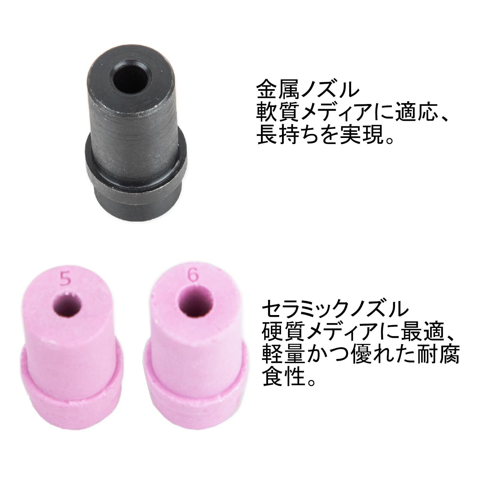二種類ノズル付き:金属ノズルの特徴は軟質メディア(樹脂など)に適応、高い耐久性と長寿命を実現。セラミックノズルの特徴は硬質メディア(珪砂等)に最適、軽量設計かつ優れた耐腐食性。※口径6mm金属ノズル*1、口径6mmセラミックノズル*1、口径5mmセラミックノズル*1。