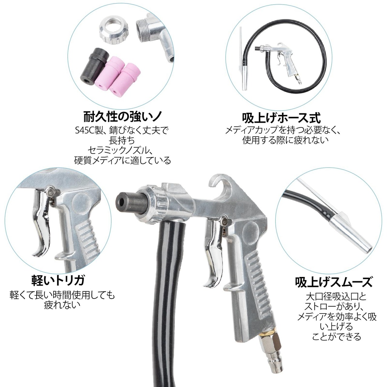 作業しやすい:吸上ホース式サンドブラスターは吹付の際に付属されているホースでメディアを吸い上げる特徴を持っており、カップを持つ必要がなく、吸込口を研磨材に差し込んだままで吹き付けることができて作業がしやすいメリットを持っています。さらに容器の容量に制限されないので、メディアを多く使用する方には特におすすめです。