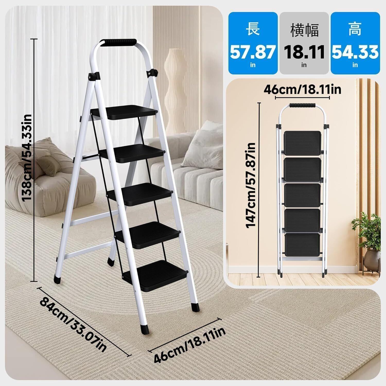 【折りたたみ設計】:脚立 5段は、コンパクトに折りたたむことができます。収納スペースを節約し、持ち運びも簡単です。