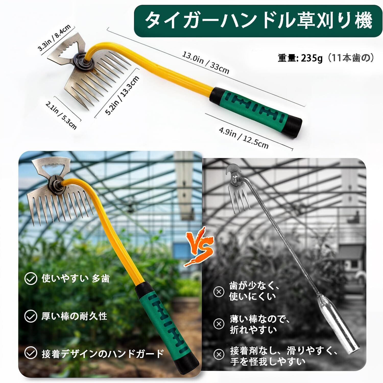 本商品は、11本の鋭い歯を持つ設計で、しっかりと根元から雑草を引き抜きます。ステンレス鋼製のブラシは、頑丈で耐久性に優れており、長期間にわたって使用できます。面倒な雑草取りを手軽にサポートします。