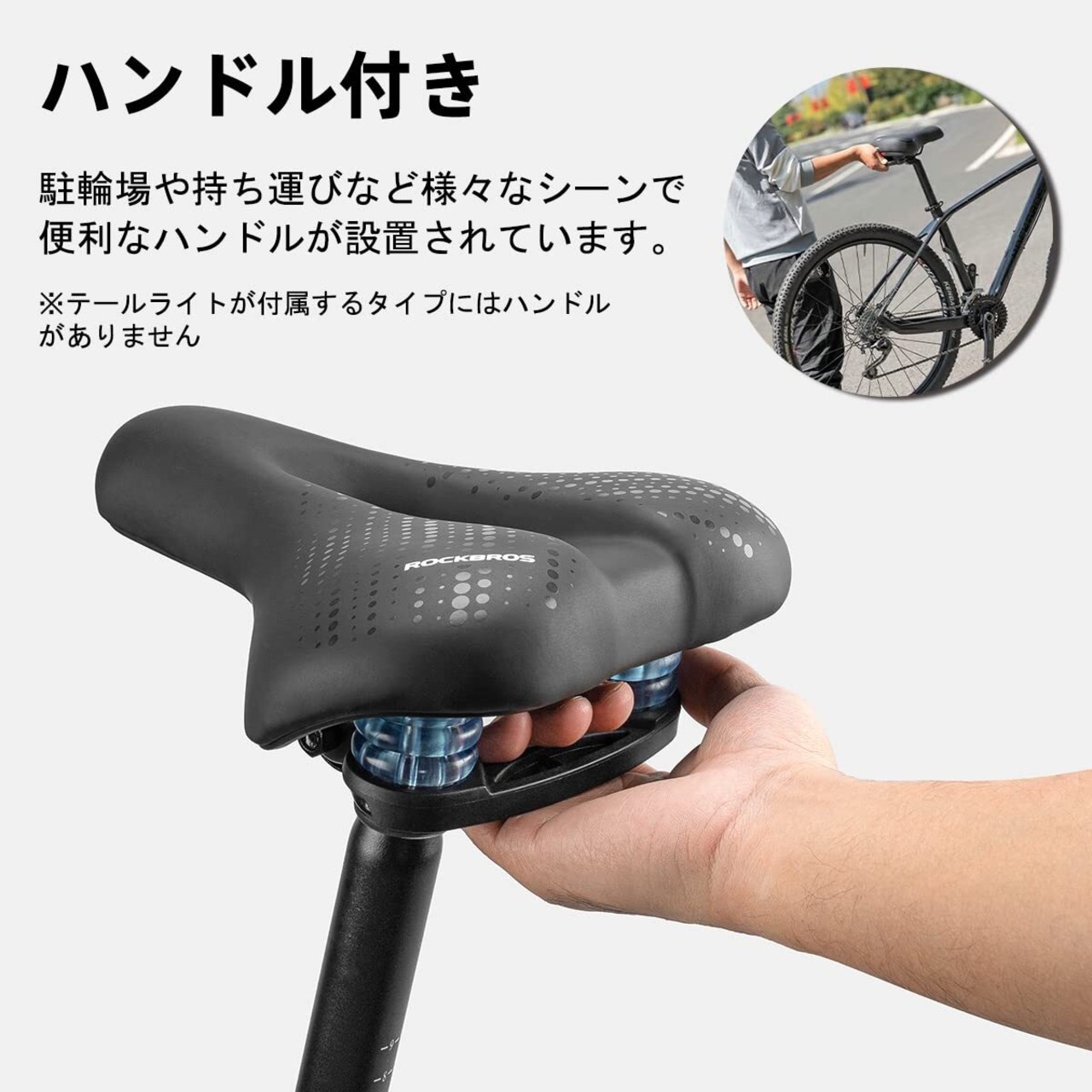 【人間工学に基づいたデザイン】流線型のデザインを採用し、前の部分はスリムになって太ももの内側と股の擦り切れを防止します。後の部分を広くして、圧力の面積を増大させて、お尻の支持力を増大させて、長時間、長距離のサイクリングでもお尻が痛くなりにくく、快適な走行が楽しめます。ワイド幅のハンドルが付きで、しっかりと手で握れることで安定した持ちやすさがあります。