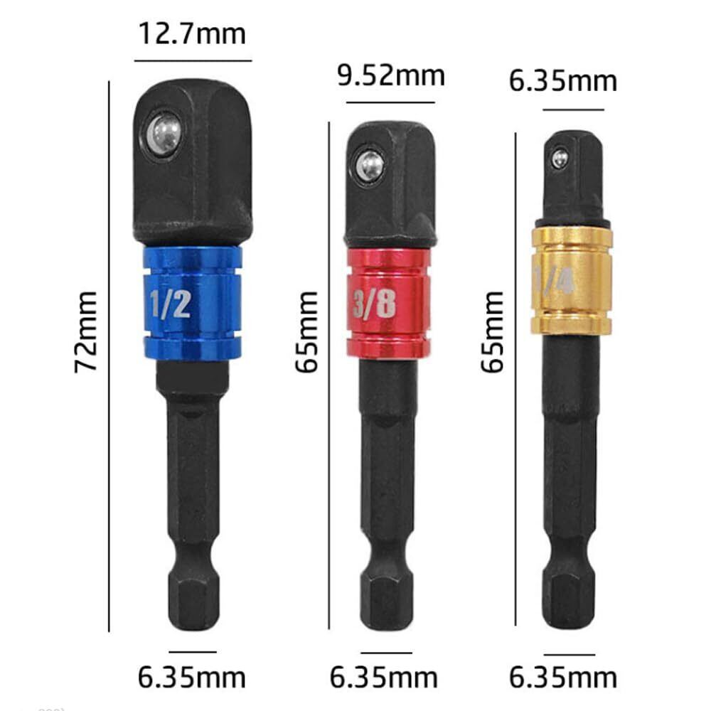 【パッケージ内容】3本組六角軸用ソケットアダプター 。軸径:6.35mm。3差込角:6.35mm(1/4″)、9.5mm(3/8″)、12.7mm(1/2″)。