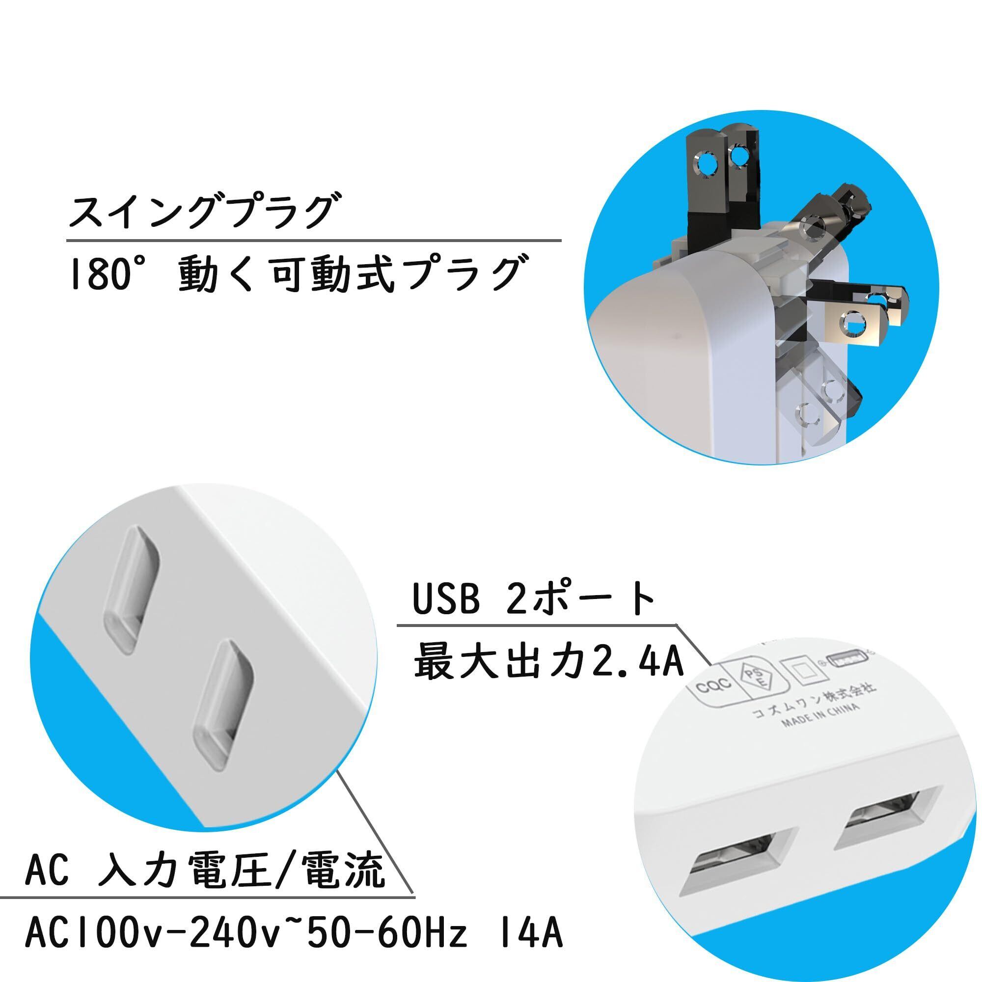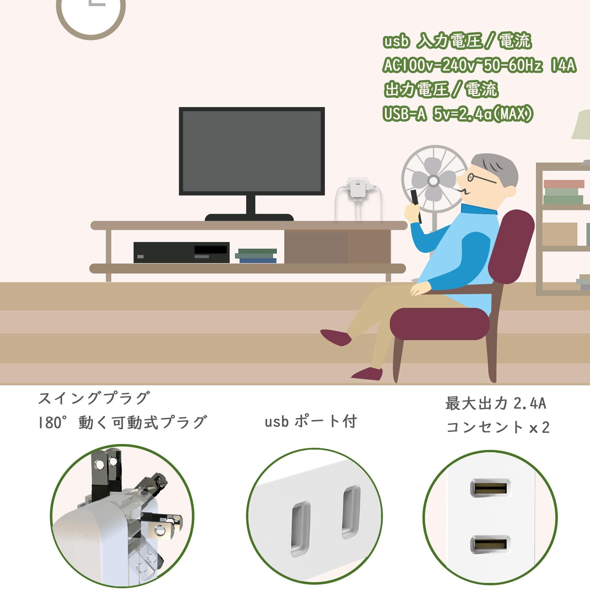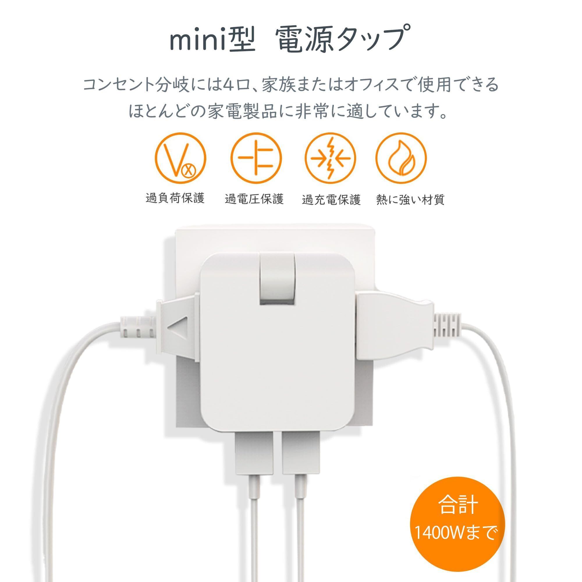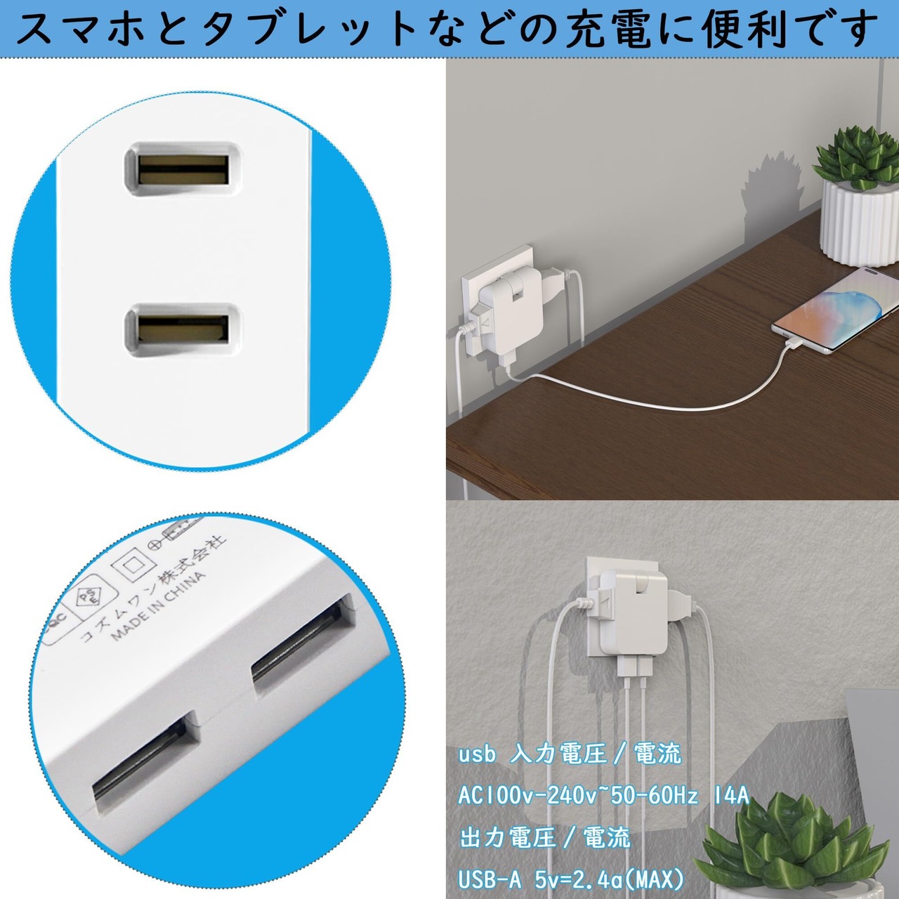 ■【一台4役 】 コンセント分岐には4口、AC口2個 USB口2個 、家族またはオフィスで使用すると、ほとんどの家電製品に非常に適しています。家の空間使用率を増やす!家と旅行には不可欠です。海外・国内問わず幅広い電圧に対応しているため、旅行用延長コード・ホテルやオフィスでの省スペース電源タップとして活躍します。