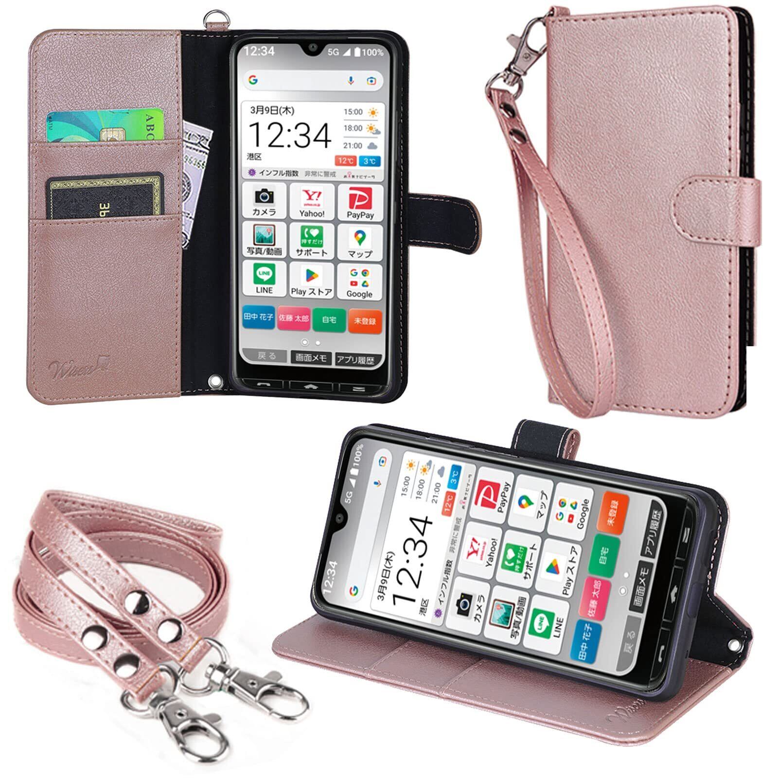 【在庫処分】wisers かんたんスマホ3 簡単スマホ3 A205KC 対応 手帳型スマホケース (ローズゴールド) ストラップ 2種付き (ハンドストラップ/ネックストラップ)