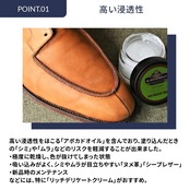 ・スムースレザー ・色の薄い靴 ・デリケートなソフトレザー ・革小物 などにご使用いただけます。 無色のジェル状で使いやすく、約97%が天然成分で作られているナチュラル志向のクリームです。森のバターと称され、自然派・オーガニックコスメにも使われているアボカドから丁寧に採油した「天然アボカドオイル」を主成分としています。アボカドオイルはべたつかず、皮革に深く浸透していきますので、乾燥した皮革の潤い補給、硬化した皮革の柔軟性アップ、皮革の劣化防止やハリを与える効果など多用途にご使用いただけます。 さわやかな香りもお楽しみください。