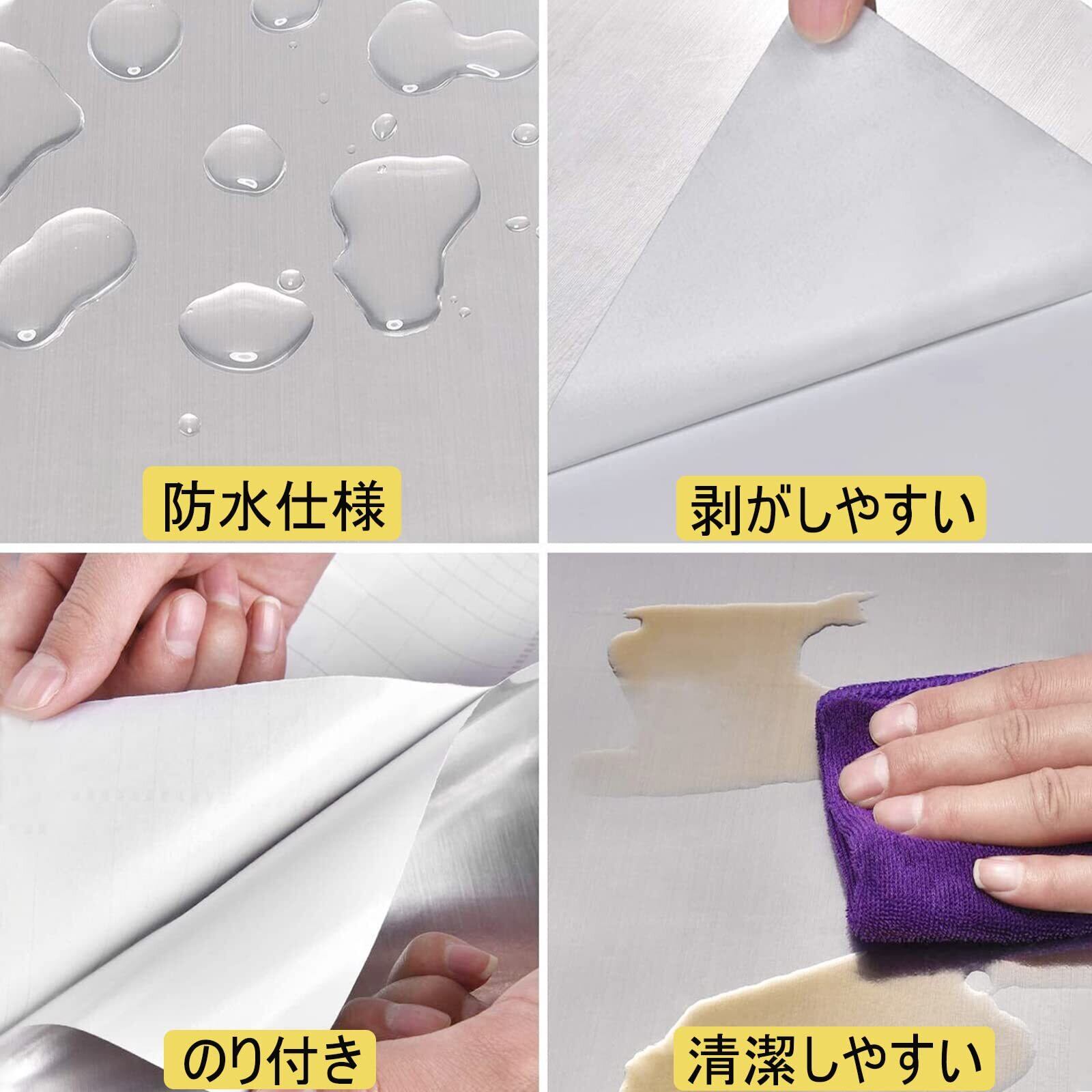 【仕様】●サイズ:幅0.4m x 長さ3m ●厚さ:約0.22mm ●タイプ:ステンレス 金属 ●素材:塩化ビニル(PVC) ●色:シルバー ●防水防油 ●のり付き