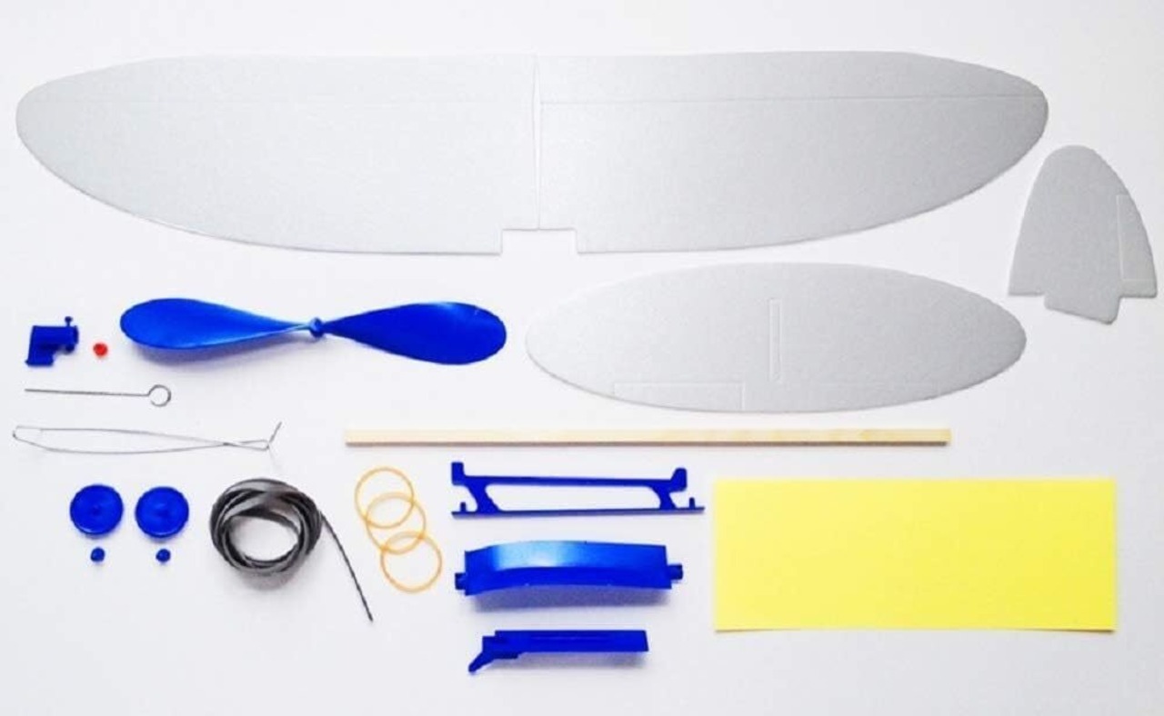 組み立てが必要なゴム動力模型飛行機。別途、木工用接着剤や工具等が必要。