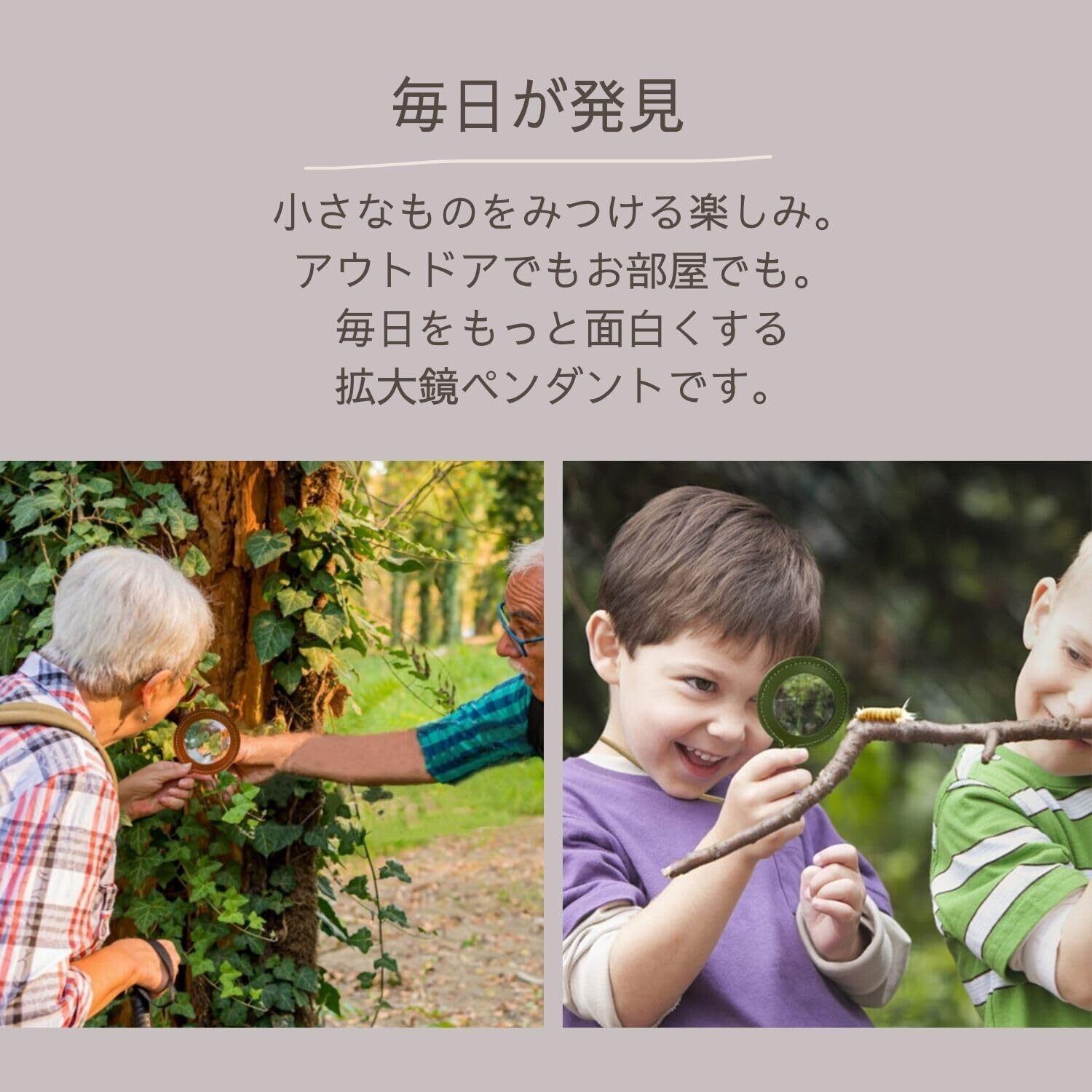 【汚れや水濡れも安心】ヴィーガンレザーだから雨・水・汚れに強く、好奇心旺盛なお子様の知育玩具にもオススメです。ペンダントタイプの虫眼鏡は発見を楽しむおもちゃとして活躍します。