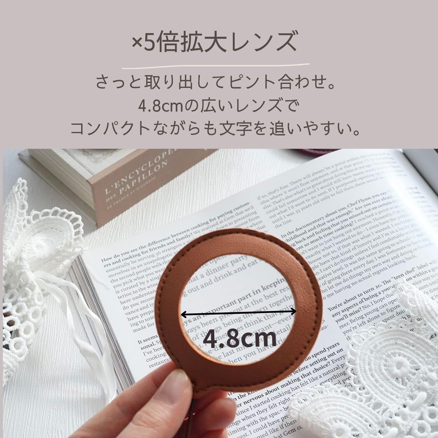 【5倍拡大・広めのレンズ】ペンダントルーペとしてさっと出したときに見やすい倍率5倍拡大でピントが合いやすく広い48mmのレンズで文字を追いやすい。小さな文字や新聞、スマートフォンの文字もすぐにチェックできます。