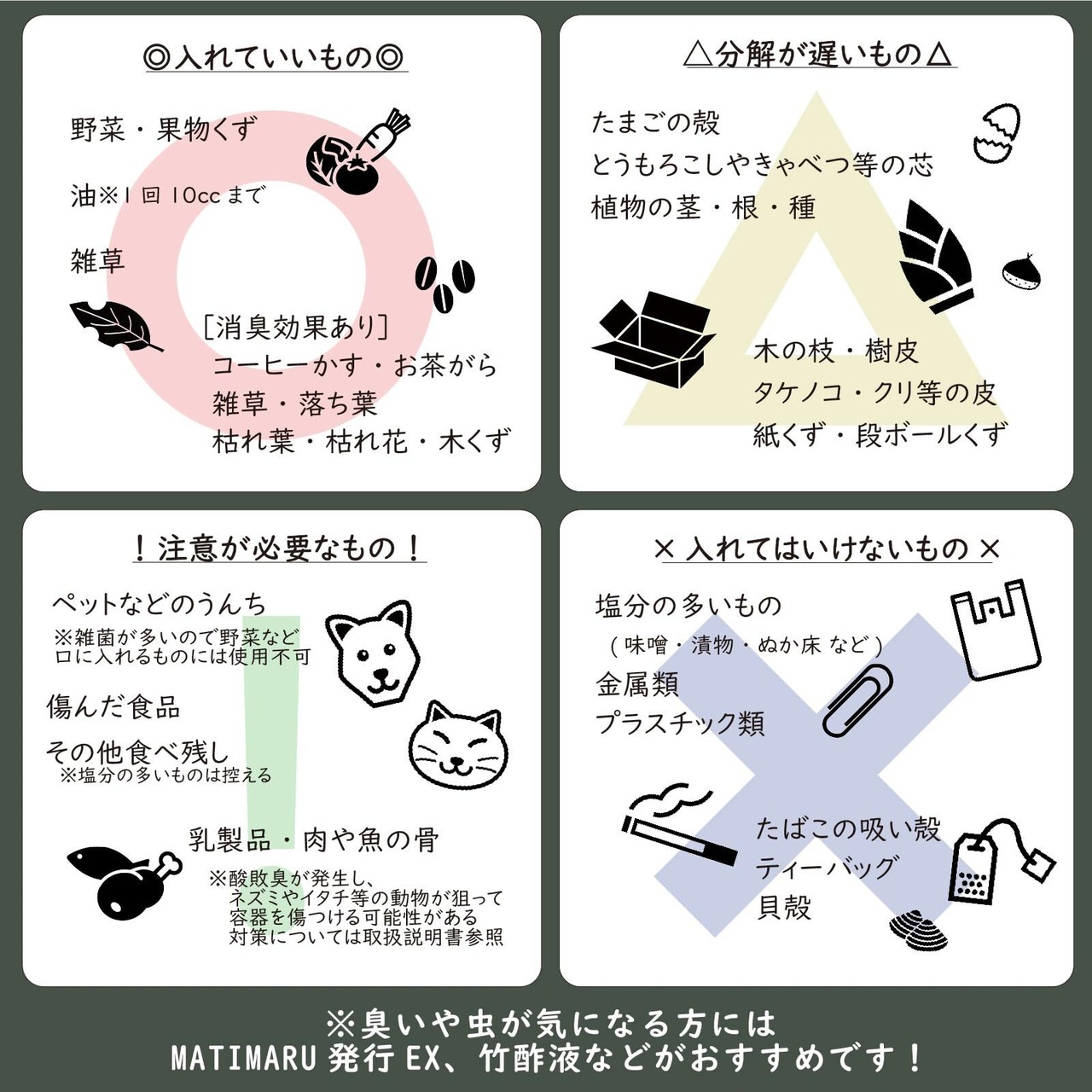 動物による被害が気になる方は、酸敗臭が多い肉類や魚類を控えてください。 土を入れなくても自立が可能です。