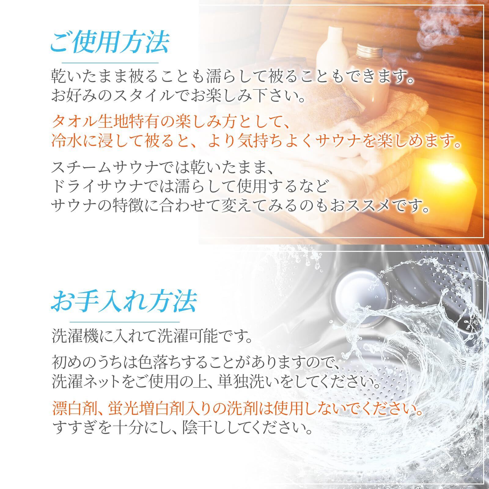 全てのサウナグッズと同様に、洗える仕様で清潔に保つことができます。使用した後は洗濯機で簡単にお手入れができるため、いつでも清潔感を保て、長くご愛用いただけます。