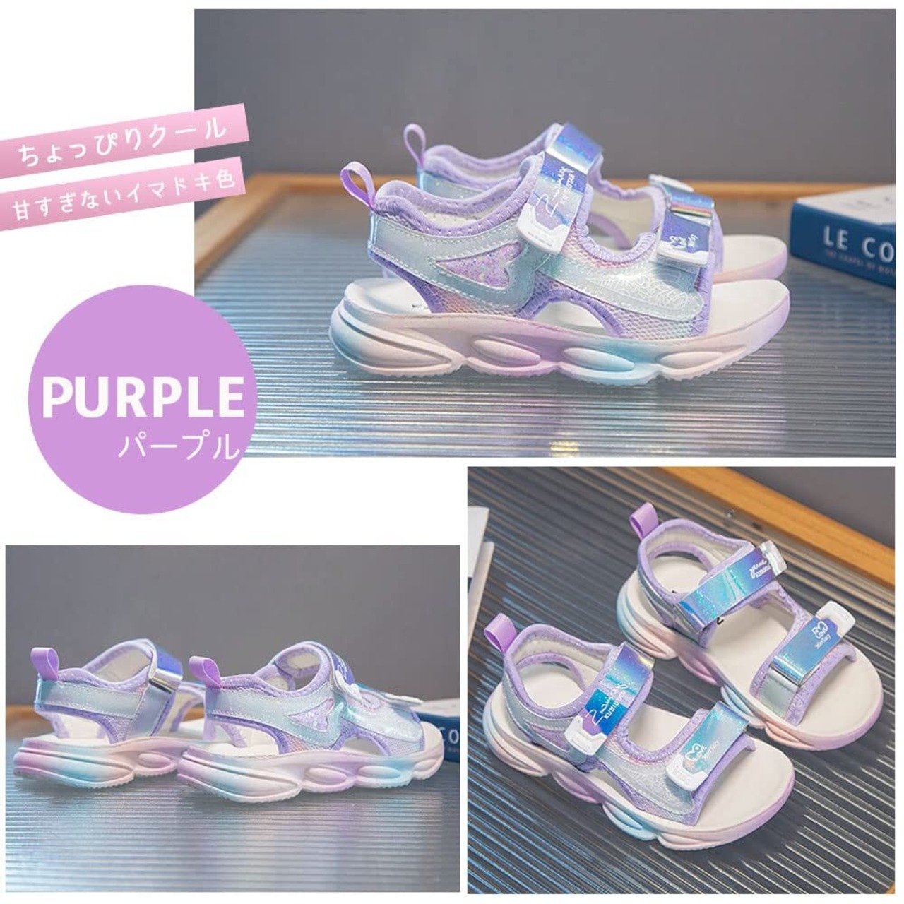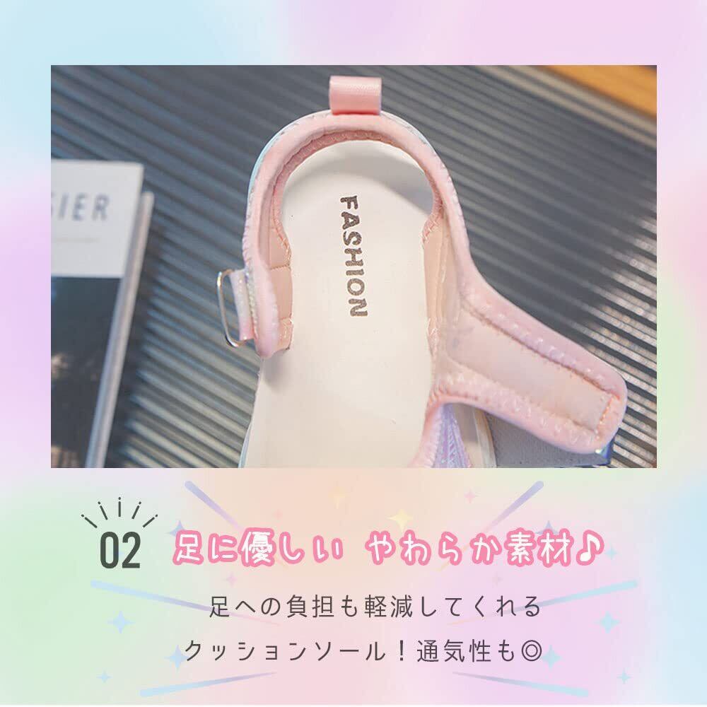 【トレンド感あふれるデザイン&快適な履き心地】流行の韓国風デザインにグラデーションとグリッターを加えた、目を引くパープル/ピンクの色合いが特徴です。おしゃれな見た目で、どんな夏の装いにもぴったりマッチし、子供たちのファッションを一層引き立てます。軽量設計で子供たちが遊び回る際にも足への負担を軽減し、元気いっぱいに一日中快適に過ごせるようサポートします。海やプールなどのアウトドア活動にも最適な厚底を採用したサイドバンドサンダルで、留め具はベルクロで着脱も簡単! 足首廻りをしっかりホールドできるので、つま先が出すぎるのを防ぐ仕様になっています。 柔軟性があり足に優しくフィットしてくれるので、快適な履き心地を実感できます。派手すぎないグリッターとグラデーションカラーの可愛い組み合わせです。