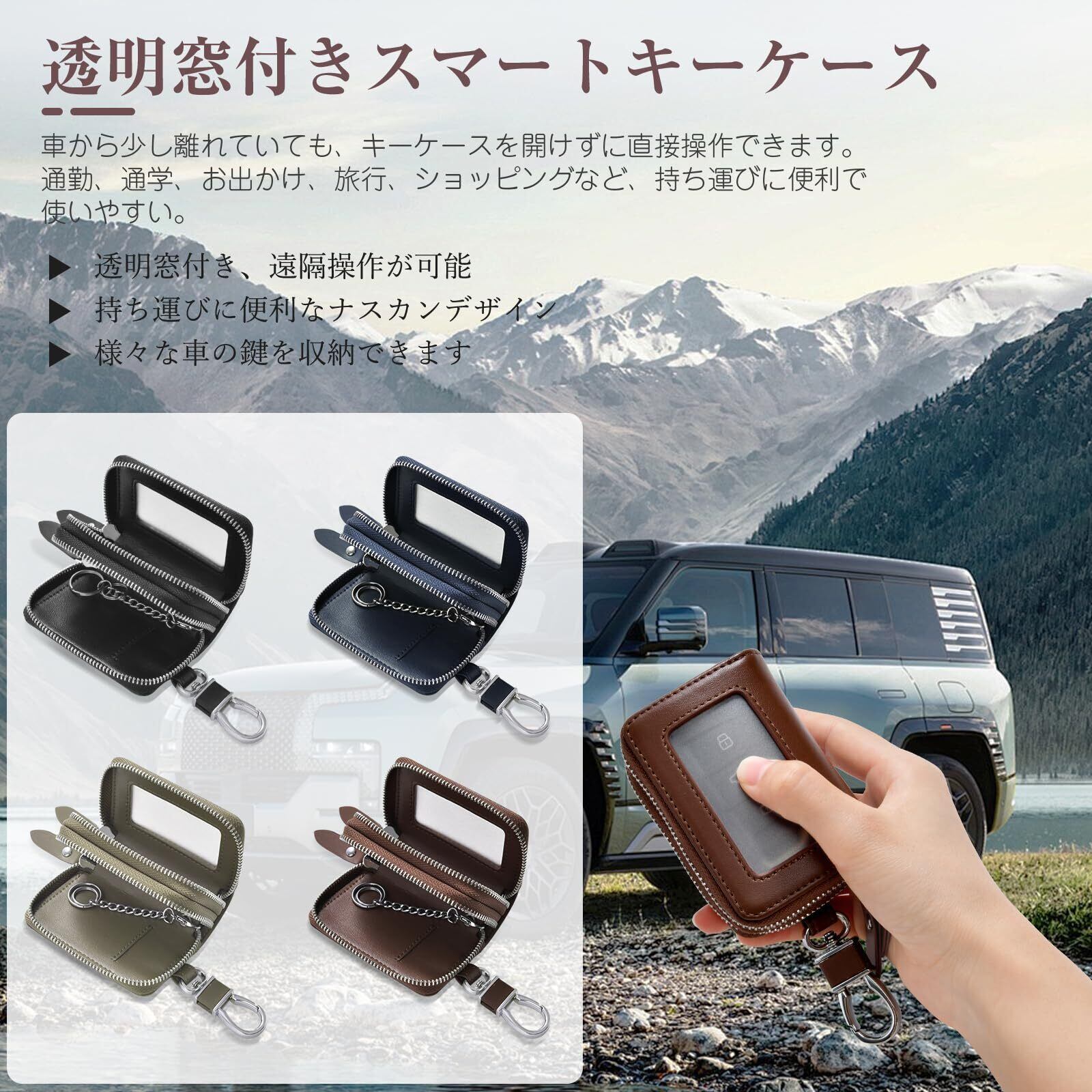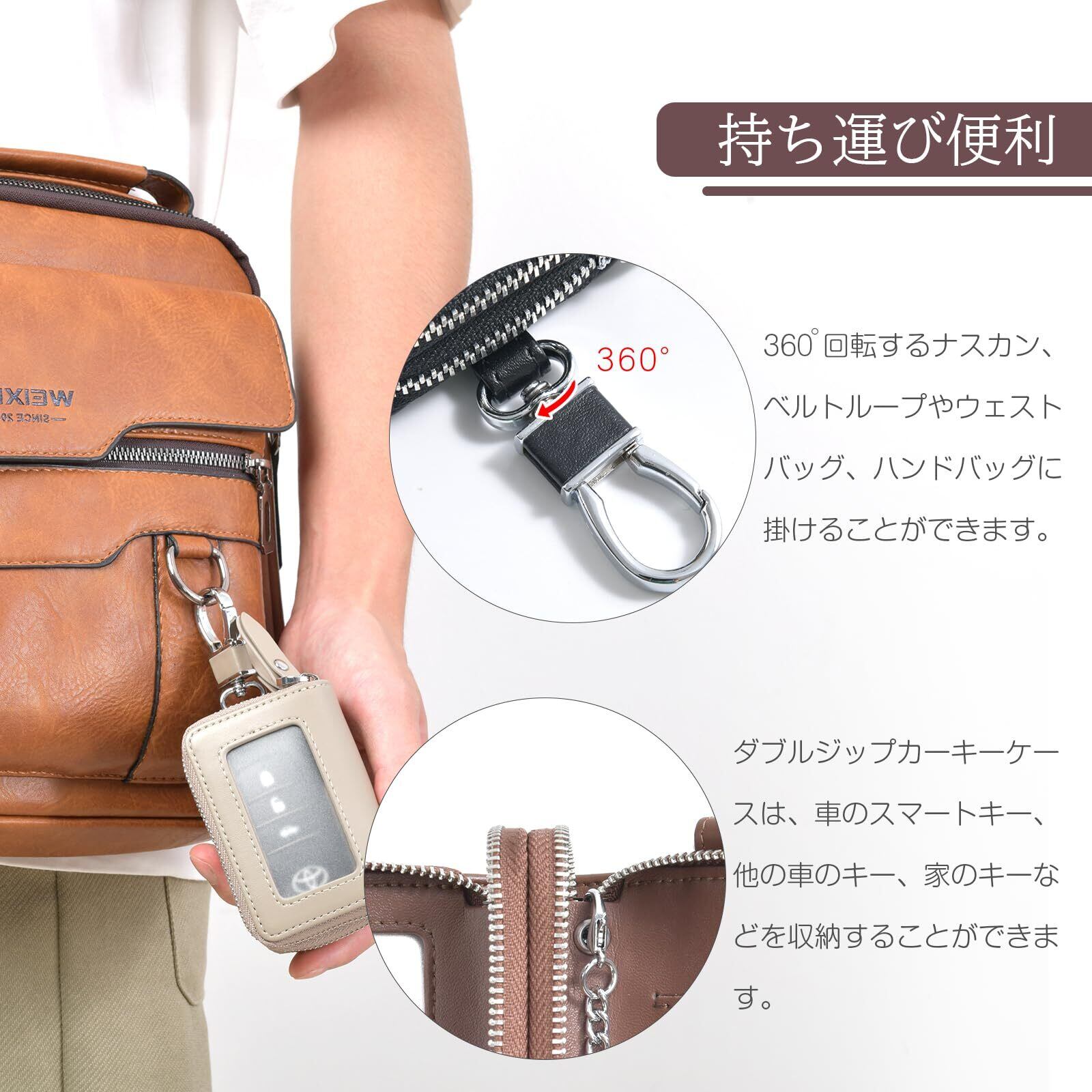 [YooFa] 本革 スマートキーケース 2個収納 メンズ レディース ダブルファスナー 車キーケース 牛革 通勤 おしゃれ クリア窓付き 鍵 カラビナ付き レザー スマートキー対応 カバー型 プレゼント