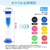【 商品内容】カラフルな砂時計6個セット(30秒/1分/2分/3分/5分/10分の各時間対応)。色分けされた6種類のタイマーで、用途に合わせて簡単に時間管理が可能。