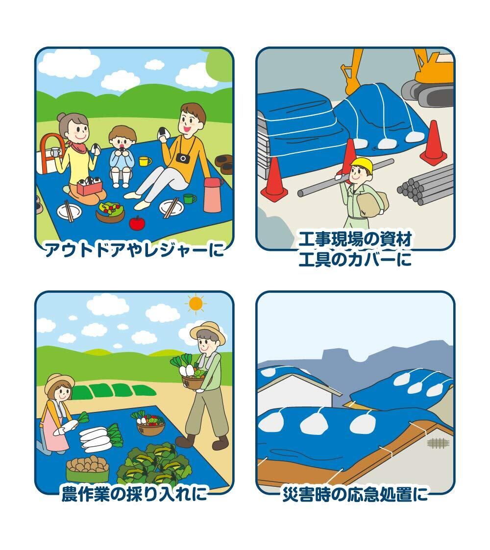 ●アウトドアやレジャーに。工事現場の資材、工具のカバーに。農作業の採り入れに。災害時の応急処置に。