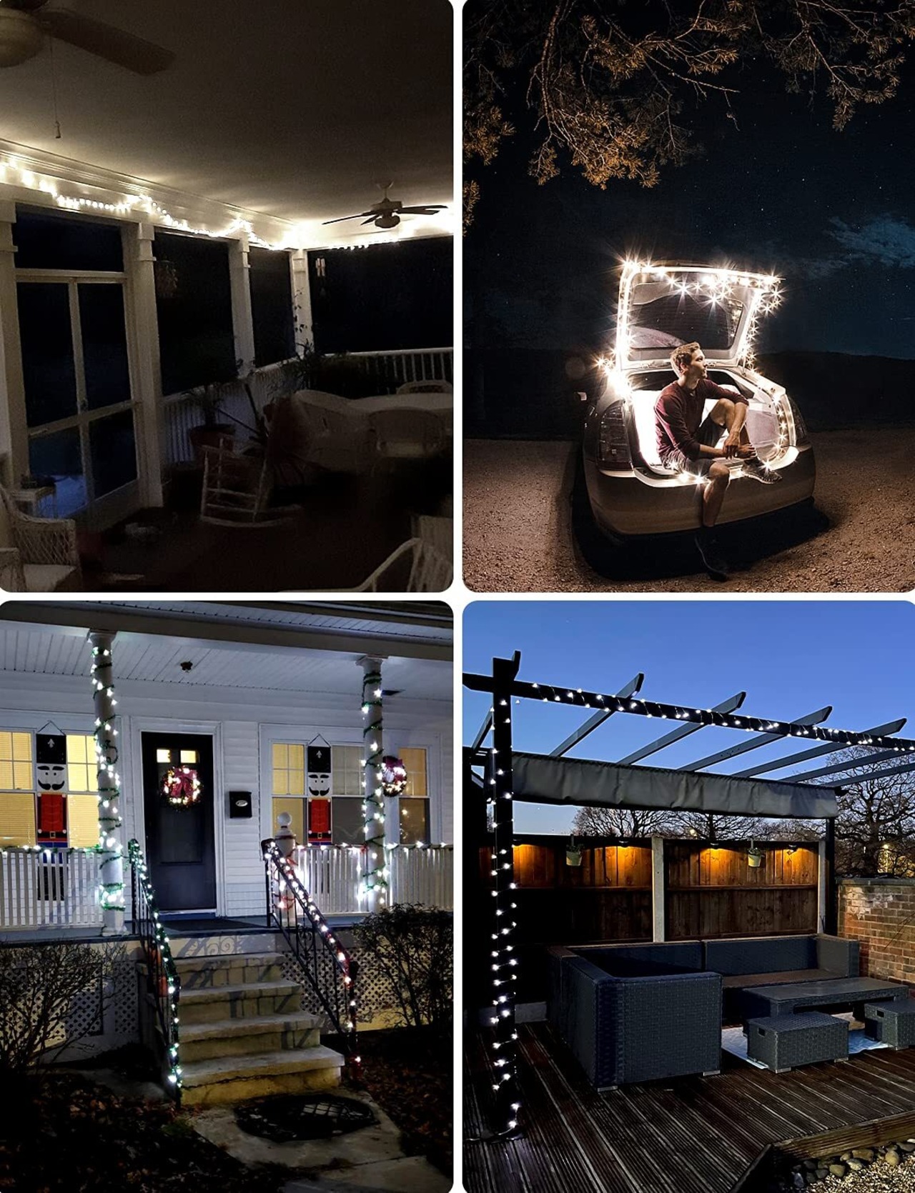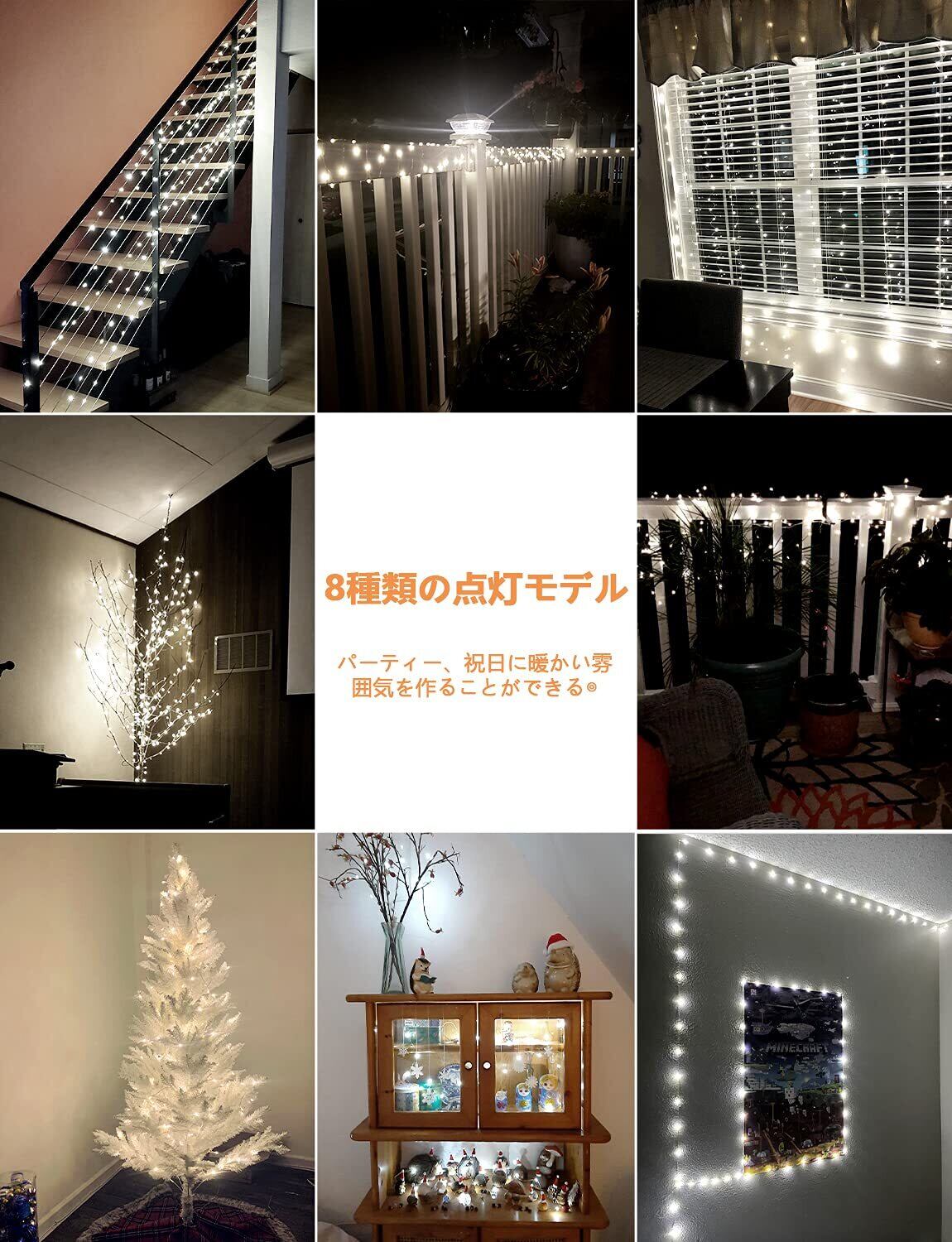 多種類の点灯モード:全8種類の点灯モードがあります。「Mode」ボタンを押すだけで、点灯モードを設定できます。パーティー、祝日に暖かい雰囲気を作成、美しい光が広がります、お庭や玄関、お店やショッピングマーケットの扉、ベッドや壁、部屋をお好きなように演出できます。