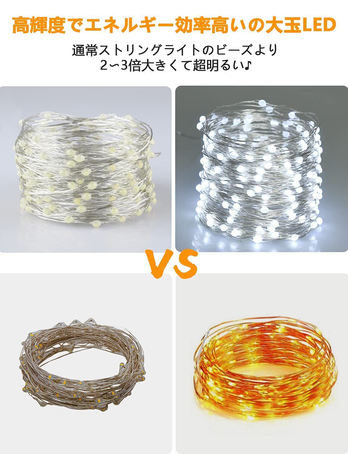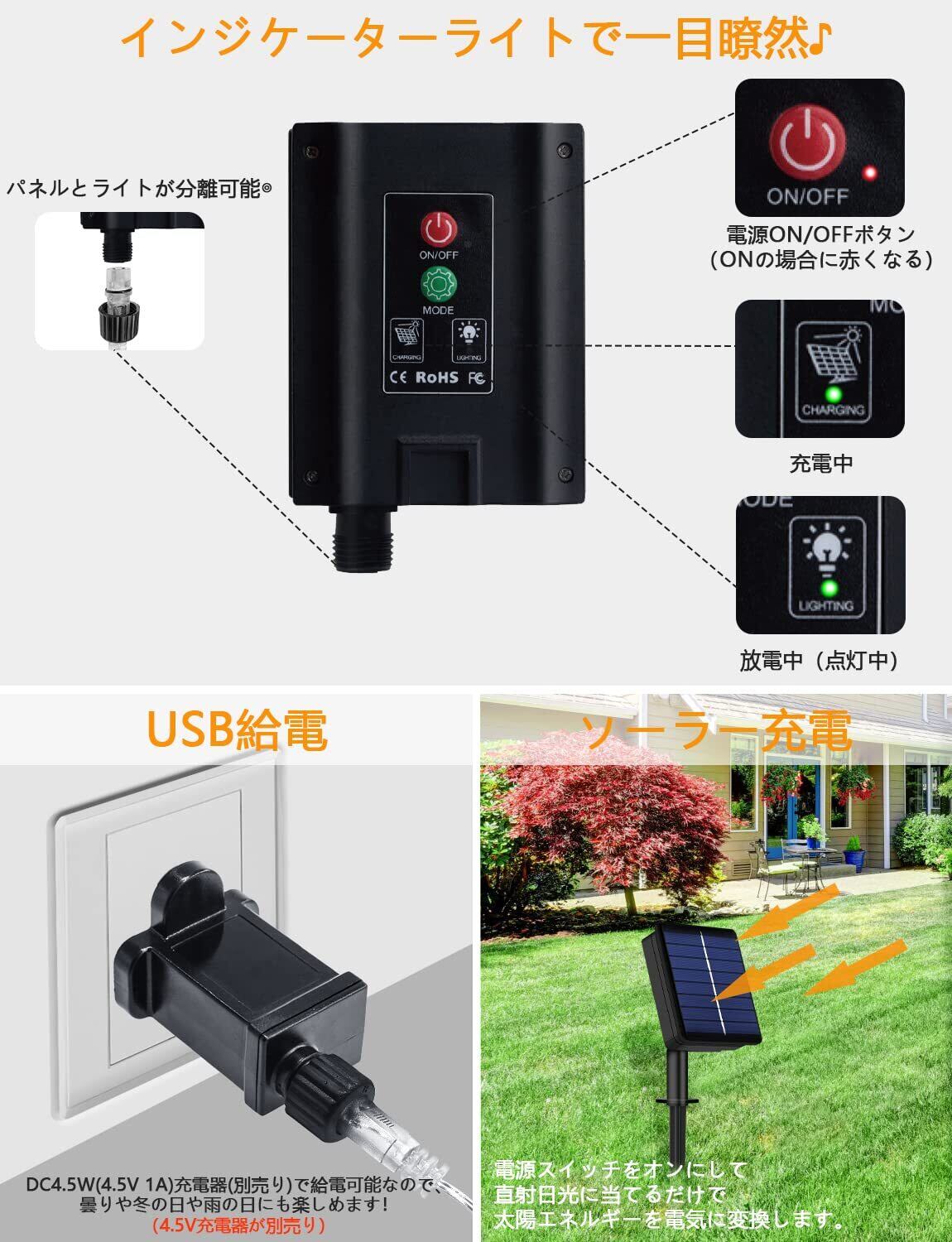 安全&省エネー:ソーラーストリングライトは大容量の1200mAh内蔵バッテリーで、ソーラーパネルの原理により、太陽エネルギーを電気に変換されまうので、エコな照明です。太陽光でソーラーパネルからバッテリーに自動充電されますので、電気代なし、コードレスなので配線も不要で使いやすいです。電気代と設置場所に困らず、省エネの上に環境に優しいです!LEDなので発熱しにくいため安全です。雨の日に曇りや冬の日に天候悪化が続き、屋外で十分な充電が出来ない場合は、DC4.5W(4.5V 1A)充電器(別売り)でLEDストリングライトへの給電可能です。
