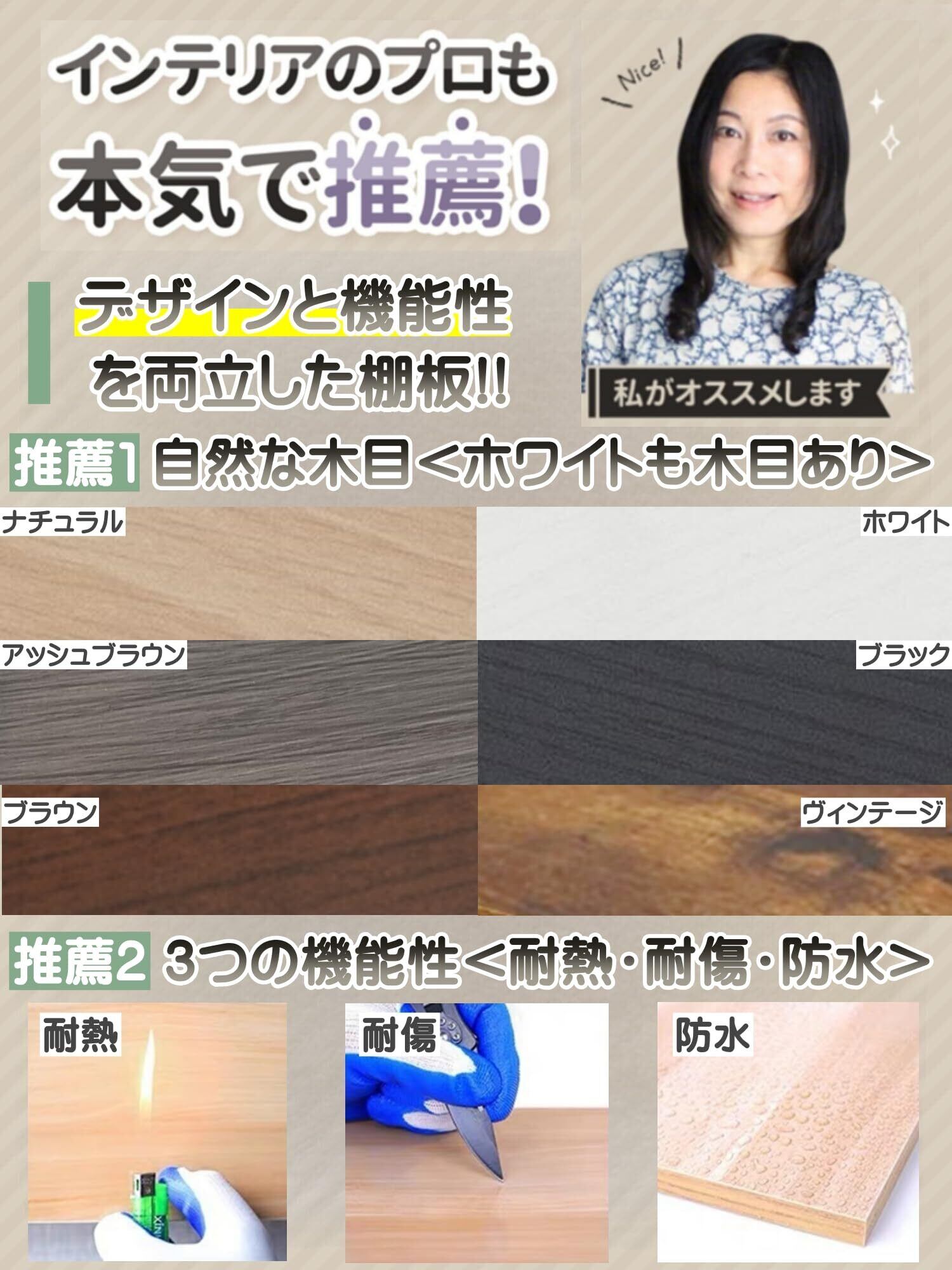 【高品質の棚板】《3つの耐性》耐久性・耐水性・耐傷性に優れた、長くご愛用頂けるシェルフです。《自然な木目》ホワイト、ナチュラル、ブラック、アッシュブラウン、ブラウン、ヴィンテージ全色自然な木目がお部屋に彩りをプラス。、ディスプレイを引き立てます!