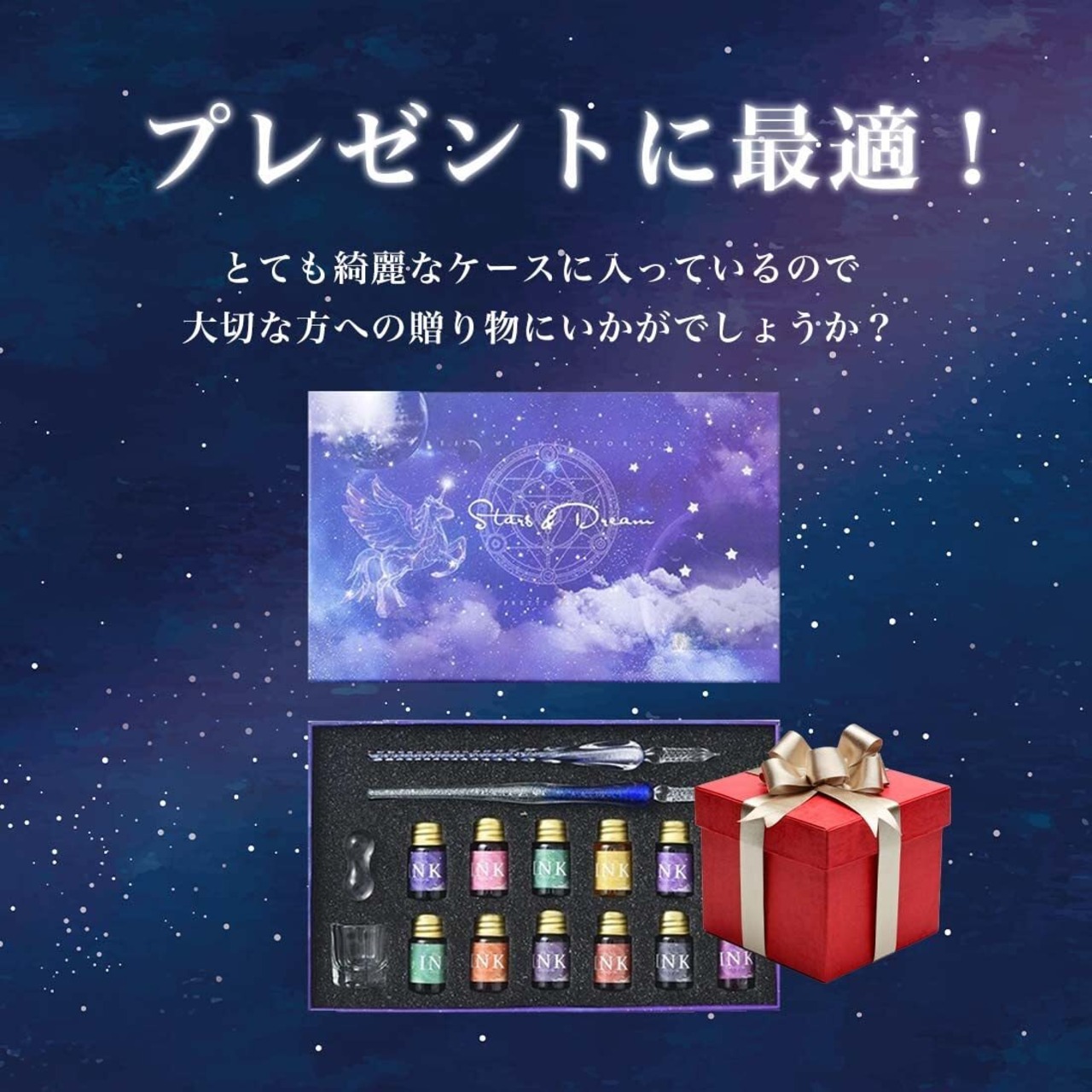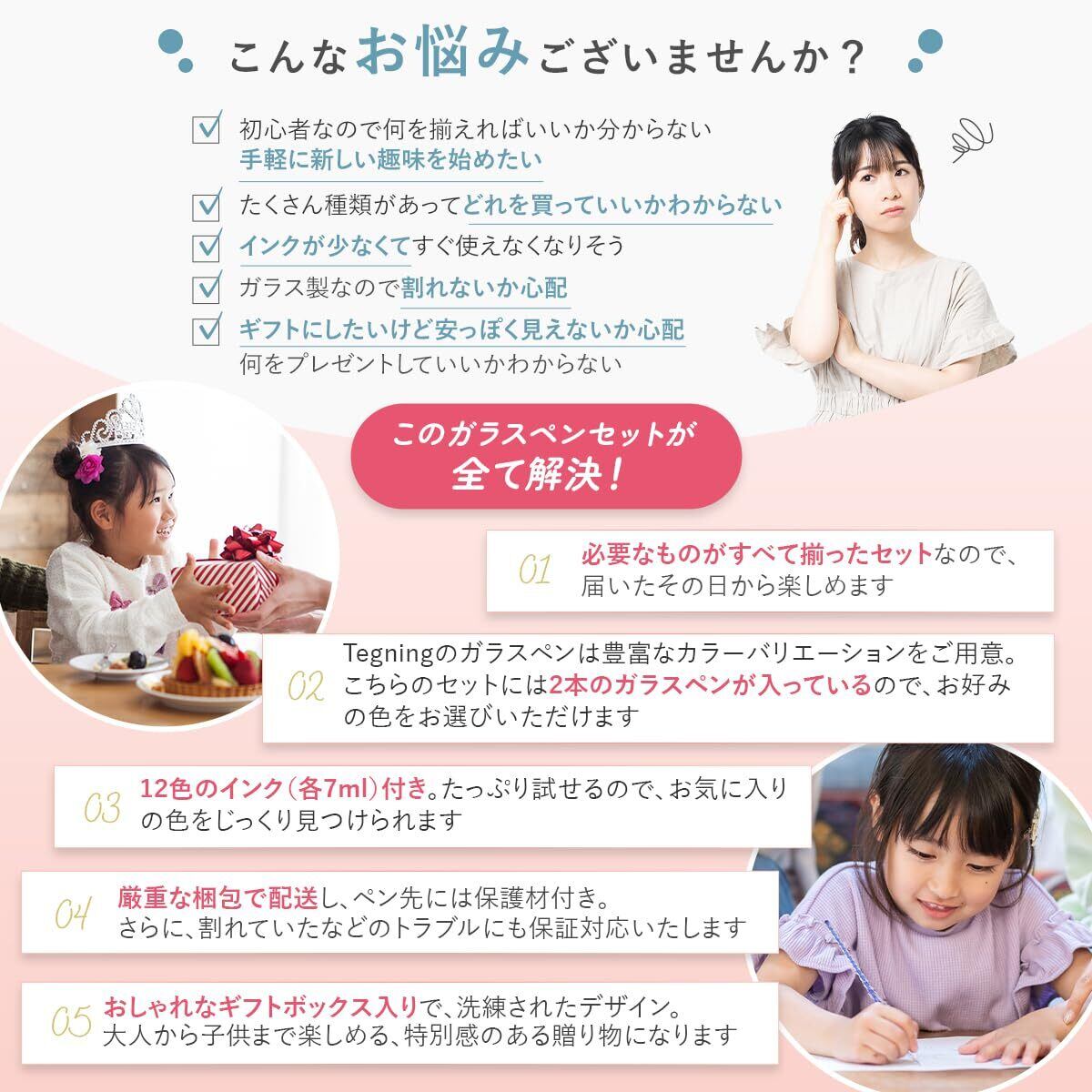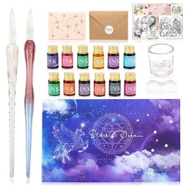 【セット内容】ガラスペン2本 (18cm)、インク12色 (7ml)、ギフトボックス型ペンホルダー、クリーニングカップ
