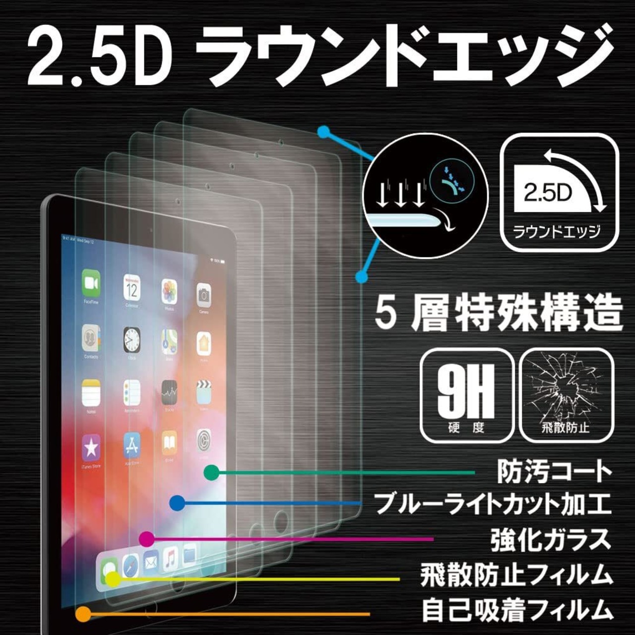 【対応機種】iPad 9.7 2018 第6世代/2017 第5世代/iPad Air2/iPad Air/iPad Pro 9.7 【仕様】国産AGC旭硝子を使用 ブルーライトカット90%~93% 高透過率99% 表面硬度9H 薄さ0.33mm 2.5Dラウンドエッジ加工 指紋防止 防汚コート 飛散防止処理 自動吸着 3Dタッチ感度対応。