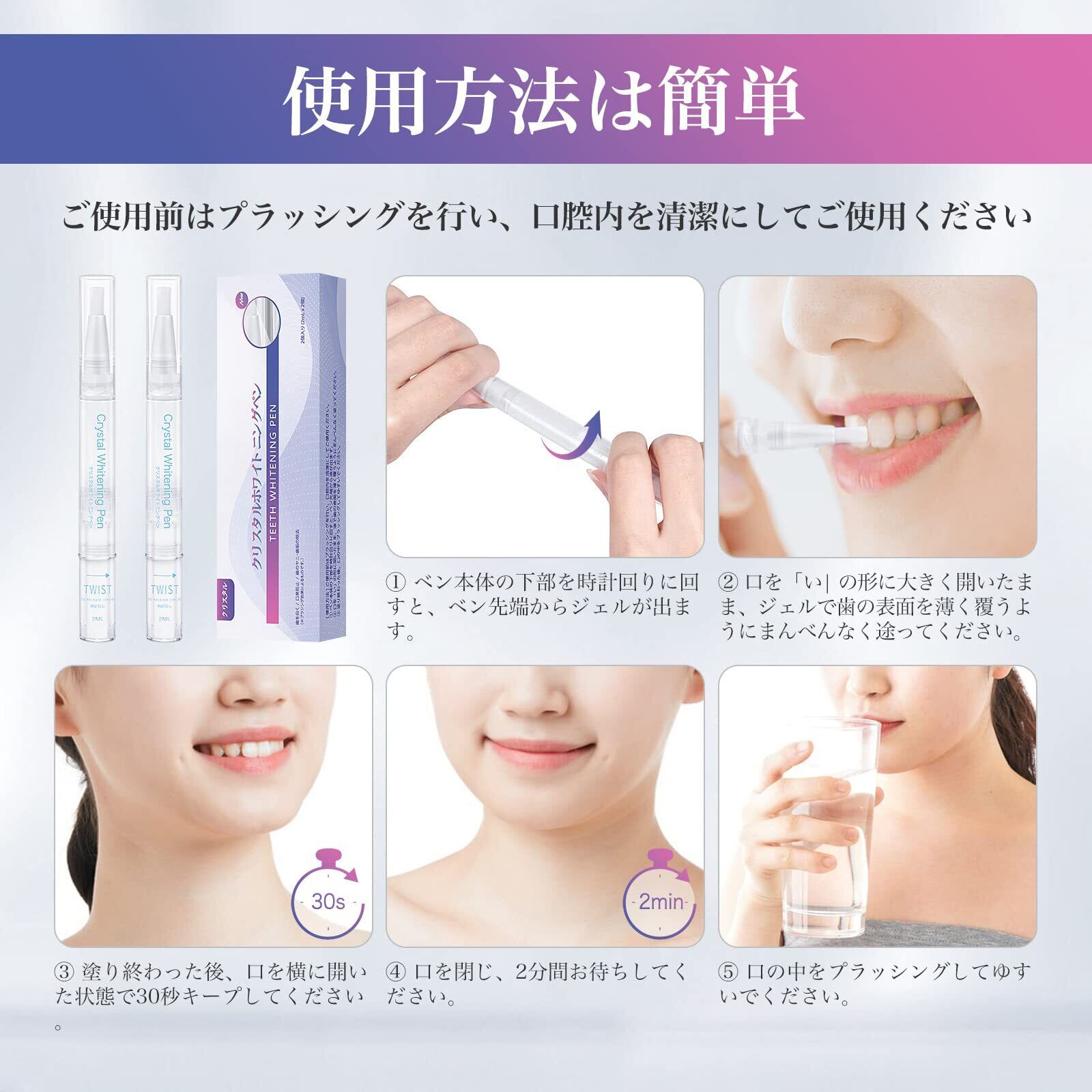 【使用方法】ご使用前はプラッシングを行い、口腔内を清潔にしてご使用ください。 ① ペン本体の下部を時計回りに回すと、ペン先端からジェルが出ます。 ② 口を「い| の形に大きく開いたまま、ジェルで歯の表面を薄く覆うようにまんべんなく途ってください。 ③ 塗り終わった後、口を横に開いた状態で30秒キープしてください。 ④ 口を閉じ、2分間お待ちしてください。 ⑤ 口の中をプラッシングしてゆすいでください。