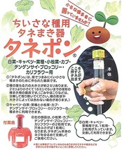 タネポンは指でつまみにくい小さな種まきのために作られた器具です。種の落ちる穴の大きさが約2ミリあります。2ミリより小さくて、1.6ミリぐらいまでの球形の種まき用の器具です。キャベツ、白菜、菜類、小松菜、カブ、チンゲンサイ、ブロッコリー、カリフラワーなどの種まきに利用できます。(ごみやほこりなどは、分解して、取り除いてください。種の形状や大きさなどによっては合わない場合があります。 1粒用、2粒用の部品が入っています。本体のネジをゆるめて交換してご使用下さい。