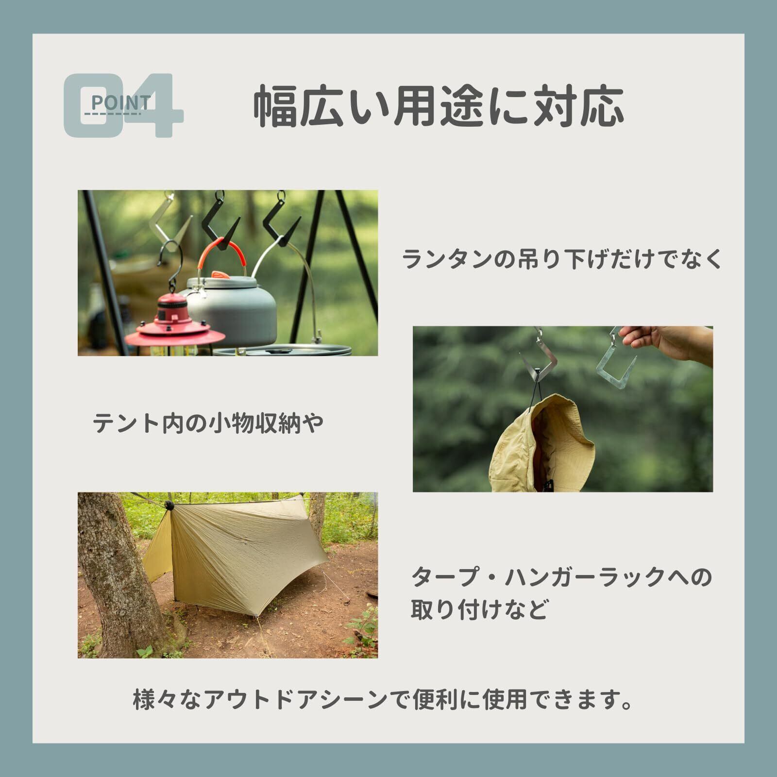 【幅広い用途で大活躍】ランタンの吊り下げだけでなく、テント内の小物収納やタープ・ハンガーラックへの取り付けなど、様々なアウトドアシーンで便利に使用できます。