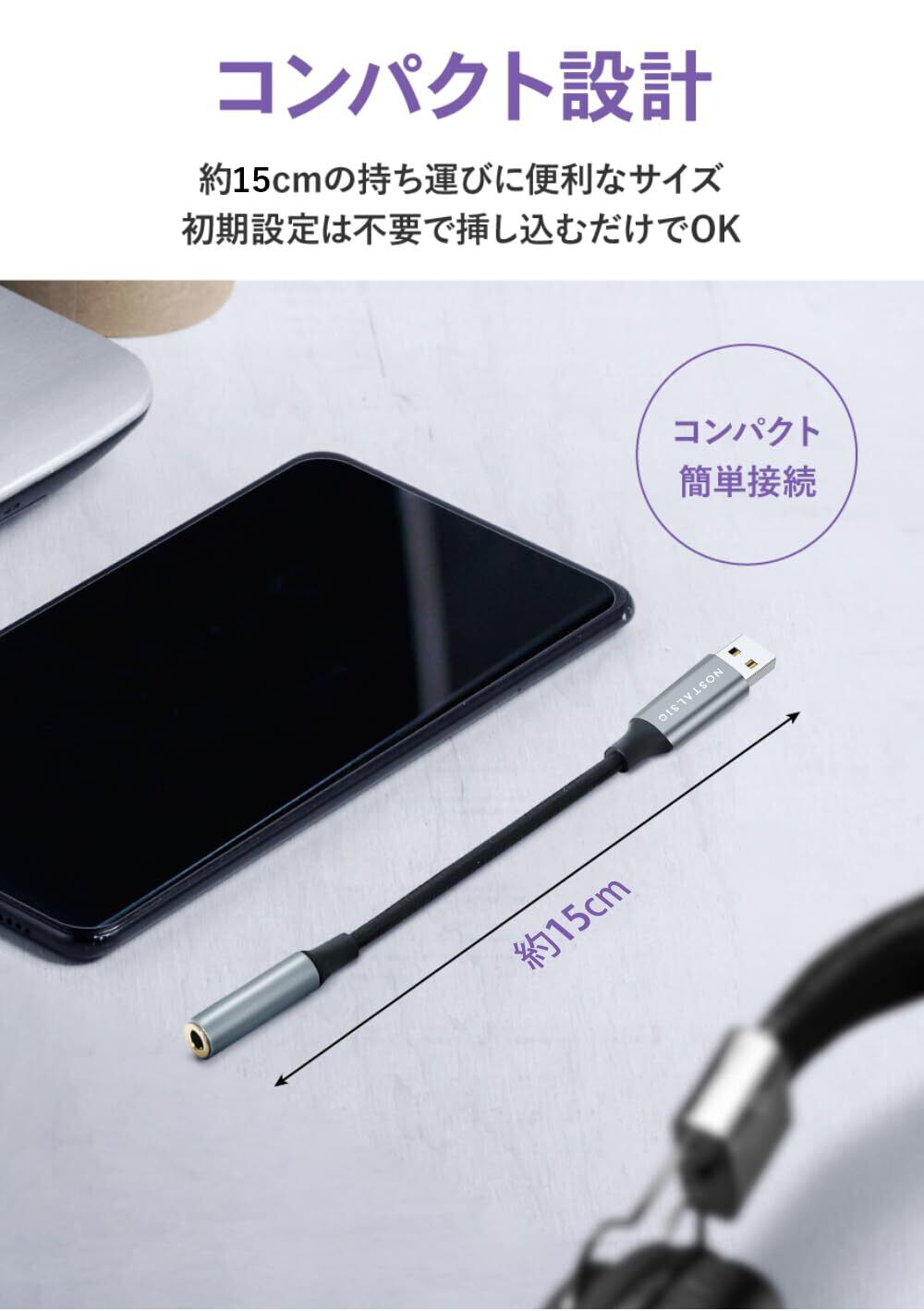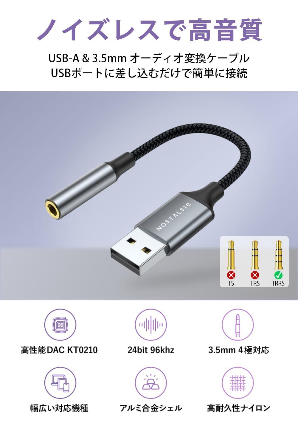 NOSTALSIC USB オーディオ 変換アダプタ USB2.0 to 3.5mm イヤホンジャック 変換 外付け サウンドカード DAC搭載 24bit/96KHz対応 4極 TRRS Windows/Mac OS/PS4/PS5/Linux/Chromebook等対応 【日本企業】 (メタリックグレー)