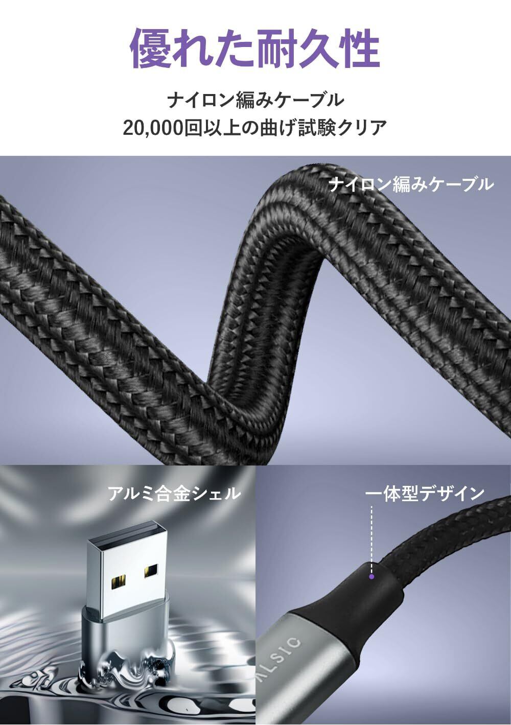 【優れた耐久性】約20,000回の屈曲試験に合格した頑丈な設計。プラグ部分にはアルミ合金シェルと高耐久ABS素材を使用し、長期間にわたり高級感を損なうことなく使えます。
