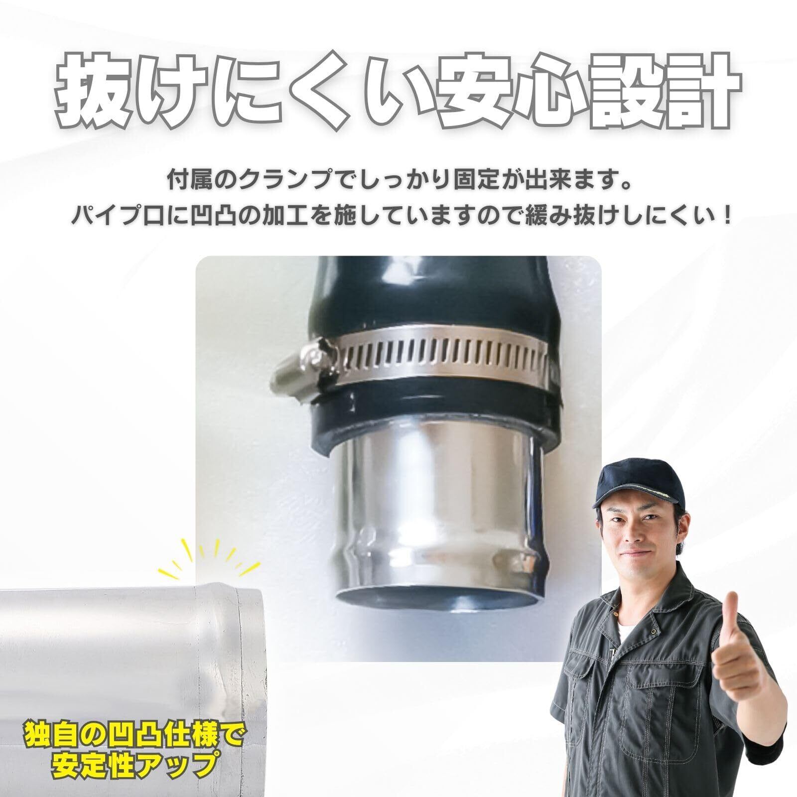 クランプ付きでしっかり固定でき、パイプ口の凹凸により緩みや抜けを防止します。