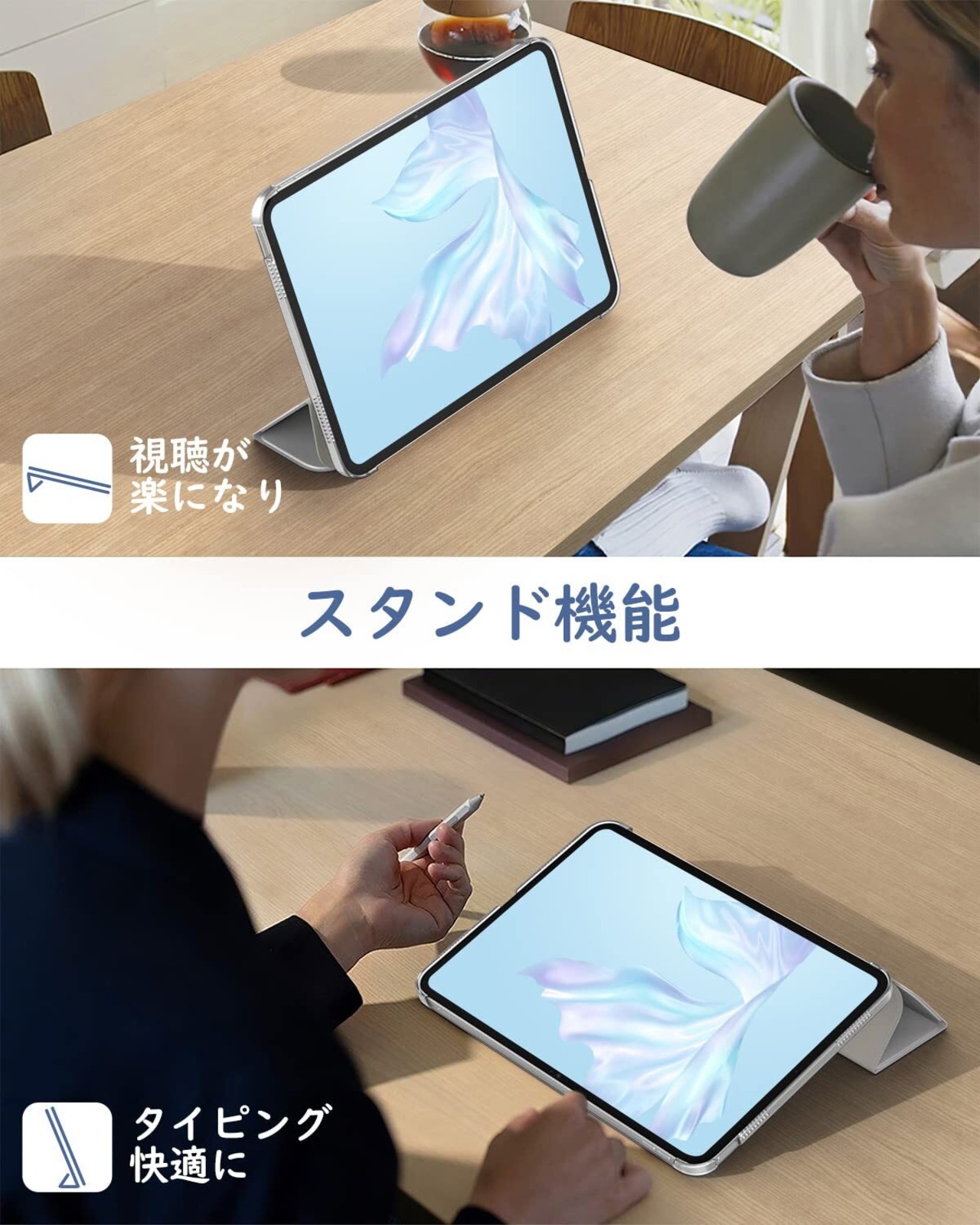 「三つ折り・スタンド機能」 カバーを折れる仕様にデザインして、折巻きしてスタンドになれて、二つの置く角度調整できて、両手解放で動画観賞や、タイピング、ゲームなども快適にご利用頂けます。