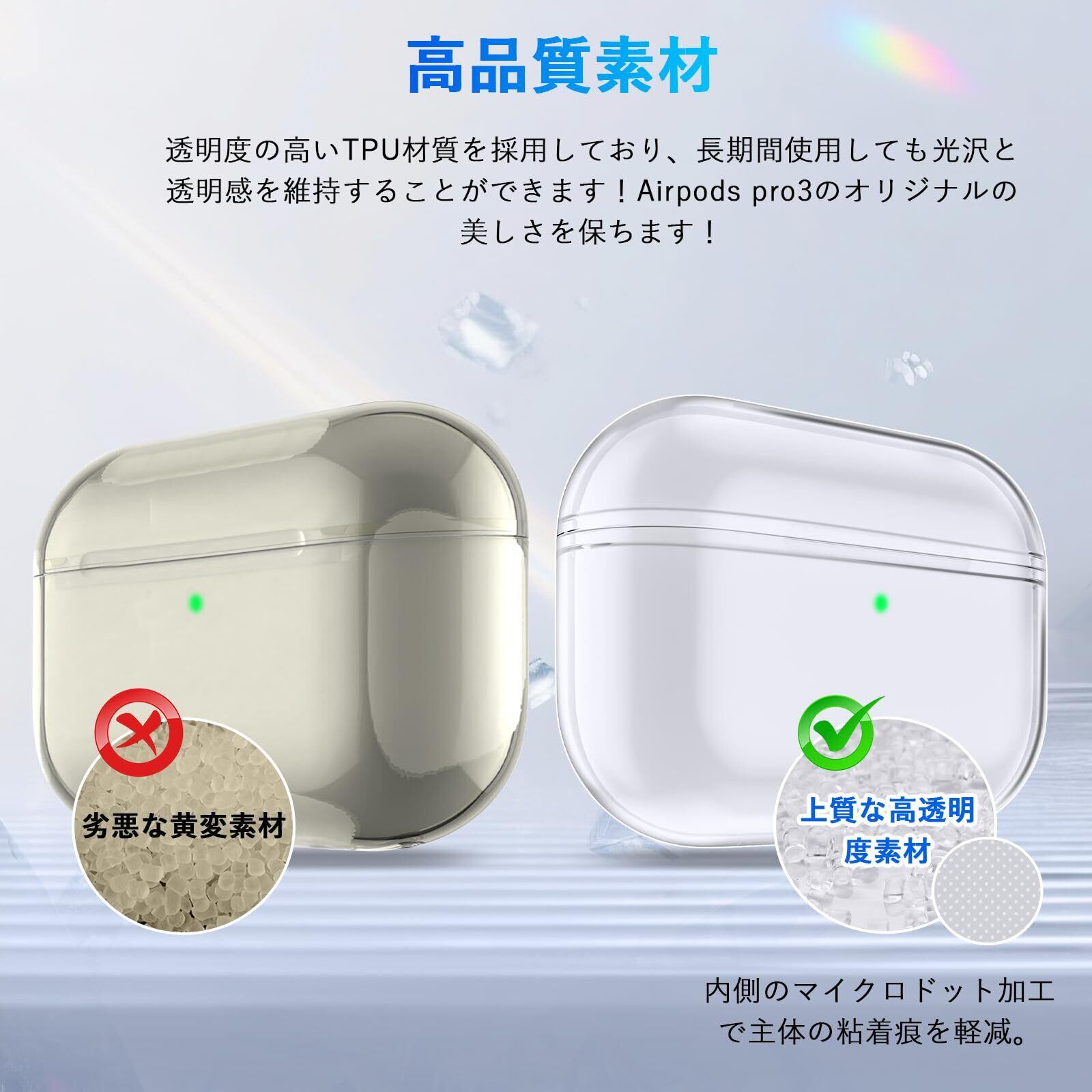 【高品質素材】透明度の高い高品質TPUで製作されるので、手触りが良くて耐久性が抜群です。Airpods pro3本来のデザインを損なうことのない、シンプルで高級感のある仕上がり。