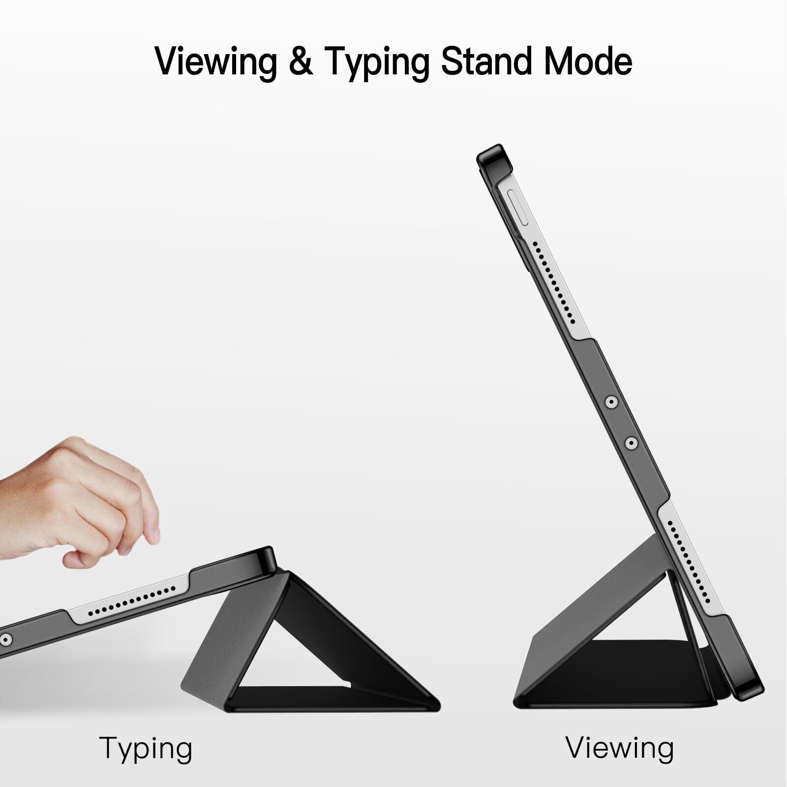 マグネット内蔵、オートスリープとオートウェイクアップ機能が付きます。三つ折りフロントカバーにより、視聴とタイピングに合わせた2通りのスタンド角度を調整できます。スタンドが正しく機能していることを確認するために、折り目の正しい向きを確認してください
