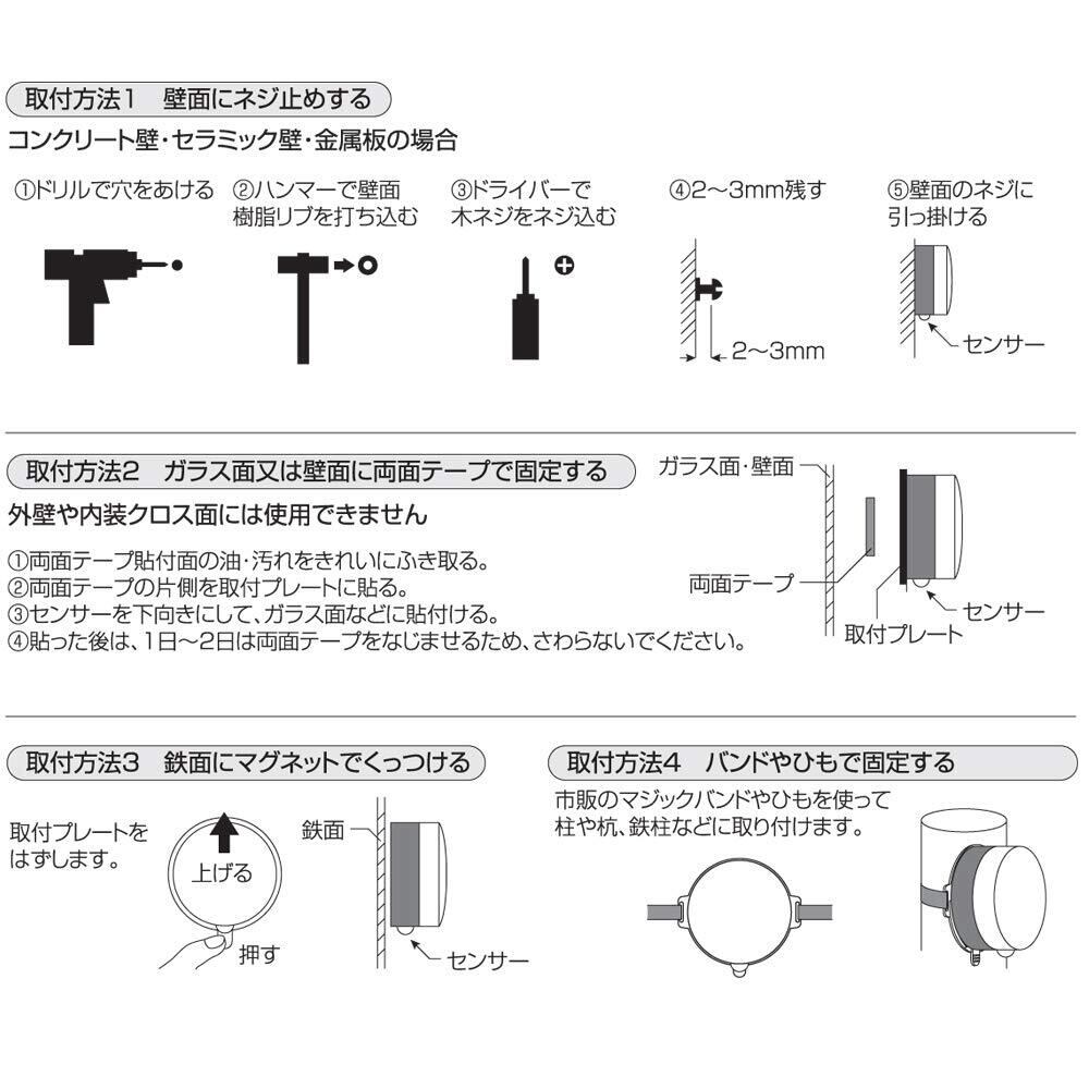 使用電池:単3形アルカリ電池×3本 (別売)、電池寿命:1日10回(15秒/1回)点灯して約10ヶ月