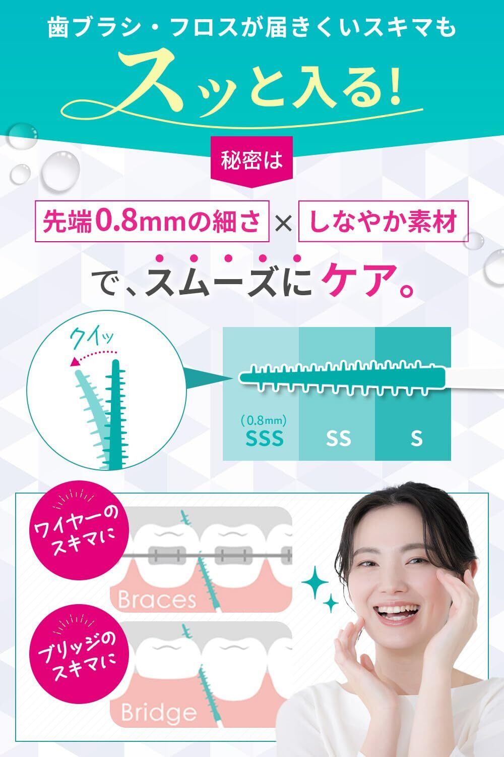 【矯正・ブリッジ中のあなたへ】フロスでは届きにくいスキマに、スッと入ってやさしく届くケアを。矯正やブリッジのある歯は、フロスが通しづらく汚れが残りがち。そんなお手入れがむずかしいスキマも、やさしくラクにスッキリとケアできます。