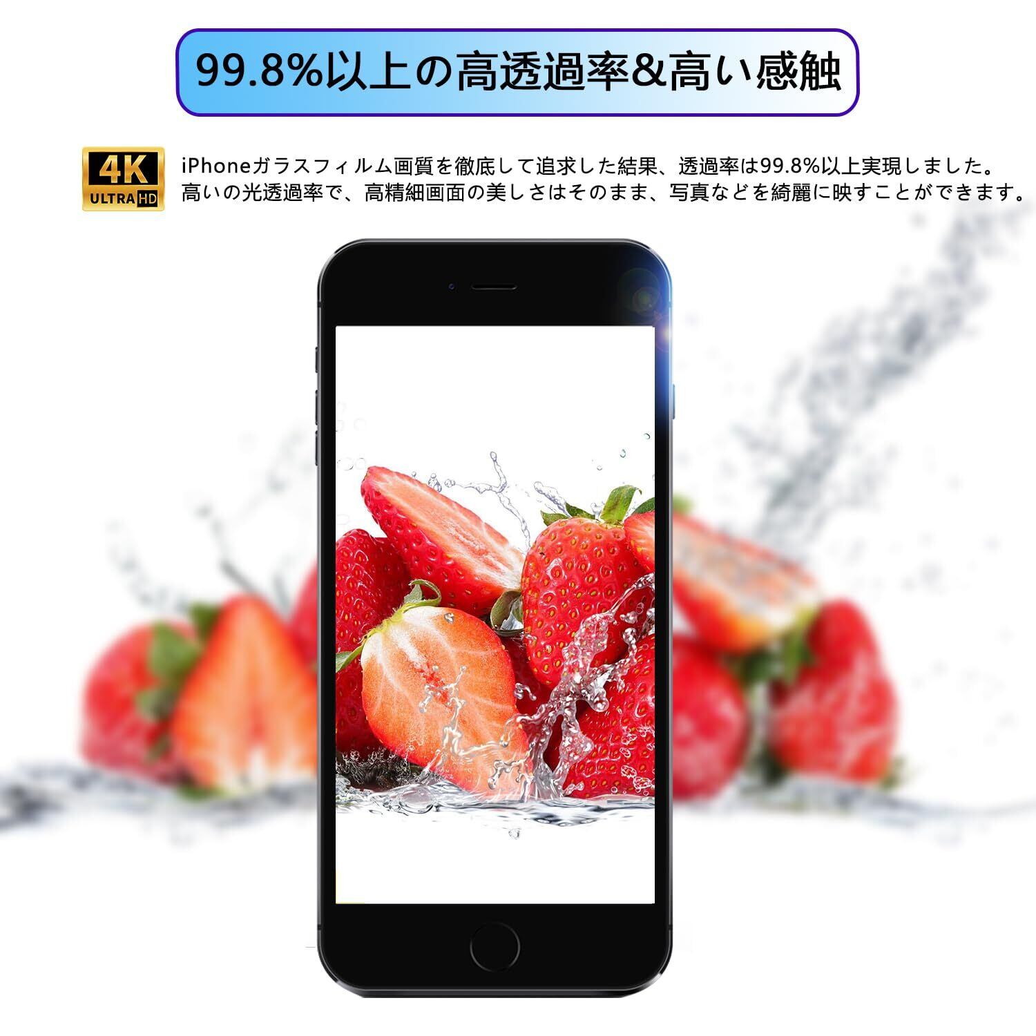 【高透過率】透過率が99%の日本製素材旭硝子を採用しています。アイフォンse2保護フィルムの透明度が高く、液晶画面の鮮明さを保ったまま保護できます。画像や動画を見ることが多い方やゲームなどでグラフィックの美しさを重視したい方には最適です。