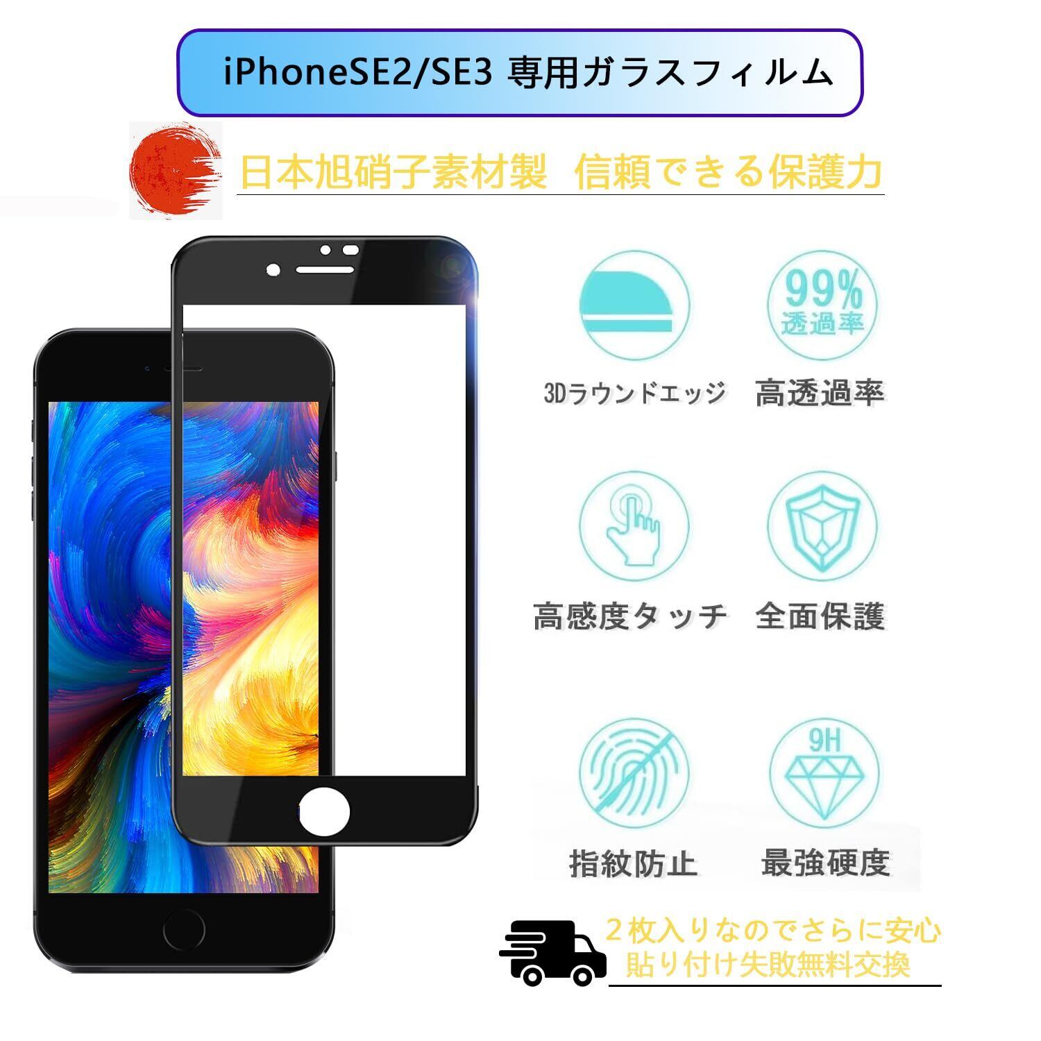 iPhoneSE2/3ガラスフィルム 【全面保護】 iPhonese2 専用 フィルム アイフォンSE2 保護フィルム あいふおんse3 ガラス se2 液晶保護 SE 2022 画面保護シート 浮きなし/秒で貼り付け/高透過率で/指紋軽減/se第二世代 用 フィルム