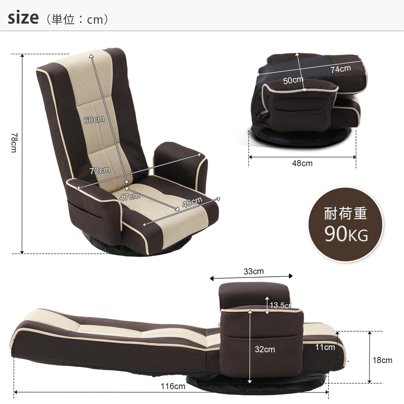 【人気座椅子の商品仕様】使用時:(約)幅72cm × 奥行47 ~ 116cm ×高さ78cm; 折りたたみ時:(約)幅50 cm ×奥行74cm ×高さ32cm 座面高: 18cm 【素材】張地:高級感あふれるメッシュ素材 生地・通気性抜群。中身:ウレタンフォーム