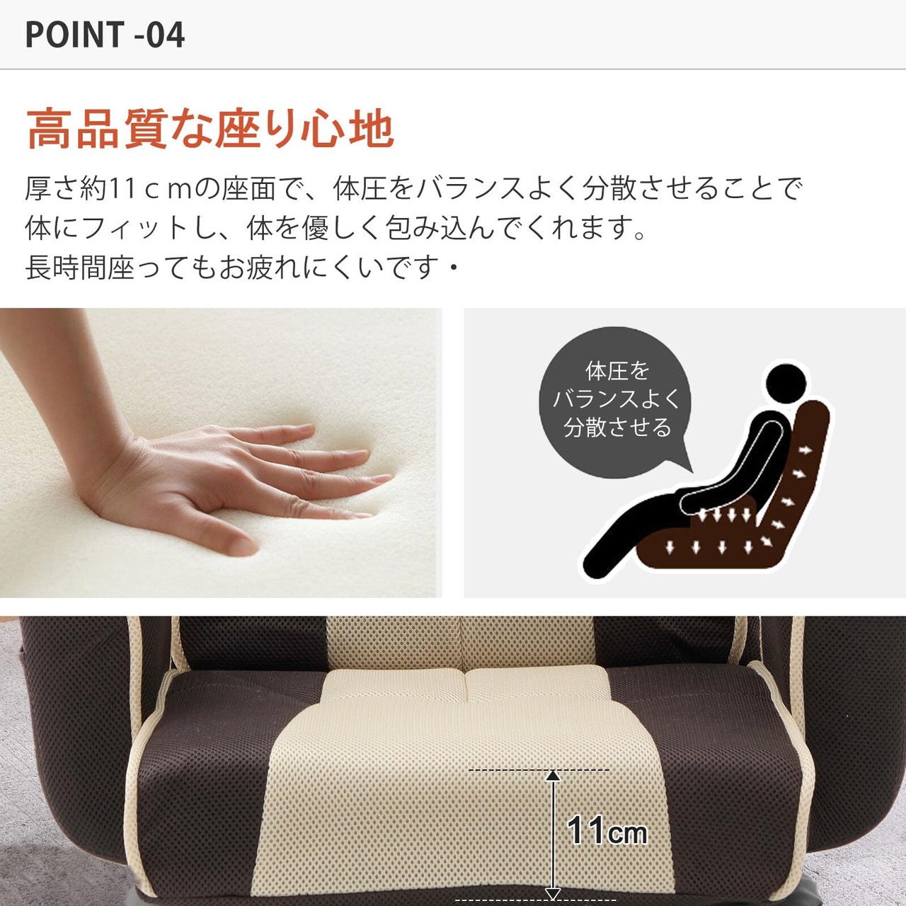 【優れた座り心地】包み込まれるような座り心地です。 身体にフィットする立体的な構造で、肘掛付きでゆったりリラックスできるなリクライニングソファ。座椅子の中身は高品質なウレタンを使い、体圧をバランスよく分散させることで体にフィットし、長時間使用しても疲労を感じません。背もたれも座面も変形・くぼみしにくく、じんわりと優しく体を支えてくれます。