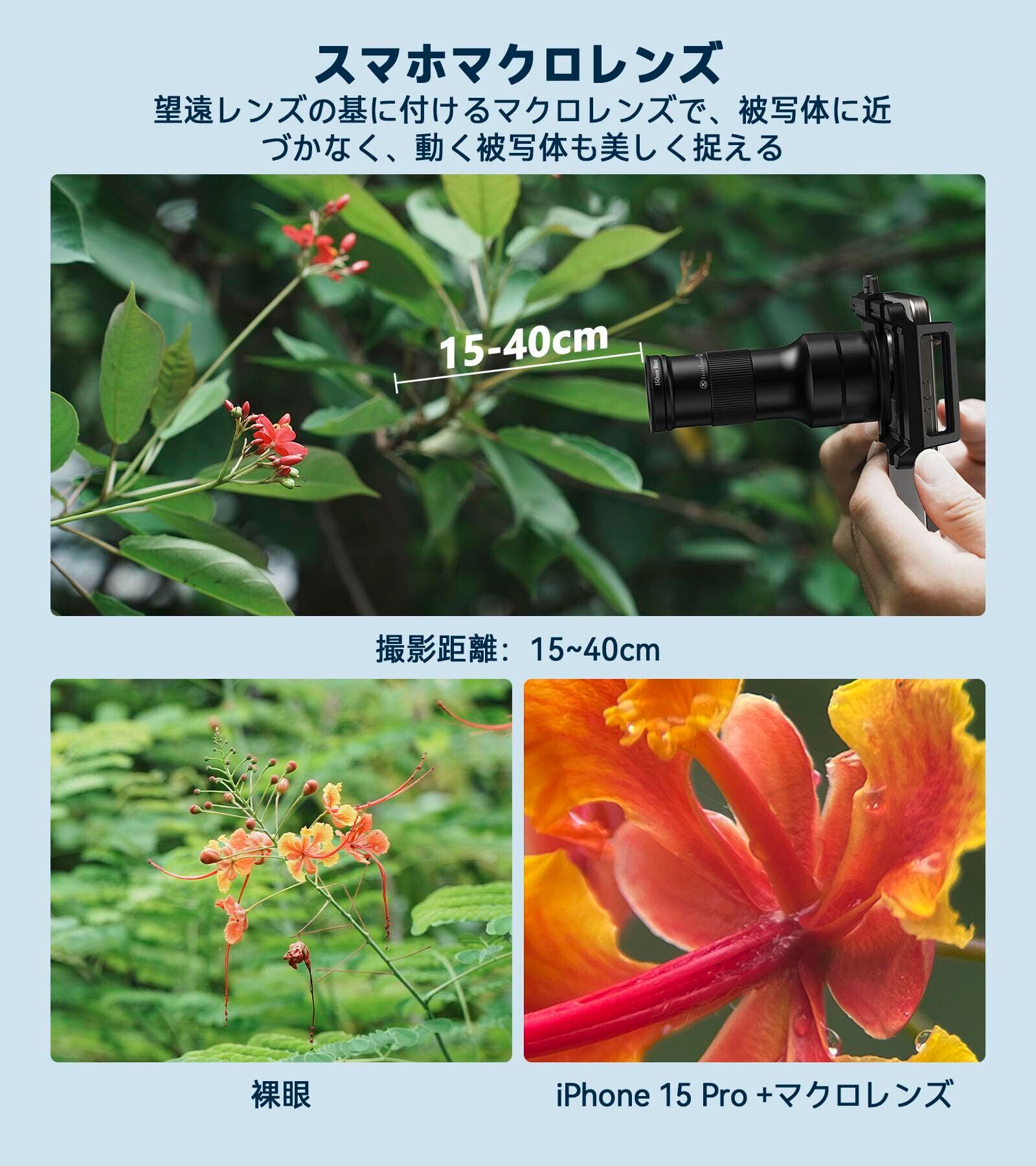 【150mmスマホマクロレンズ&対象物驚きしない】アイフォン望遠レンズに捻じ込むだけで、マクロレンズに切り替えます。遠い先の景色から身近の物に変更して撮影できるようになります。この一個一体化したスマホ外付けレンズしか持たない、大変便利になります。望遠レンズの基に切り替えの設計により、従来のマクロレンズより撮影距離(5cm)も遠くになります(15cm~40cm)。昆虫など小動物を驚きしなくて観察できるようになります。