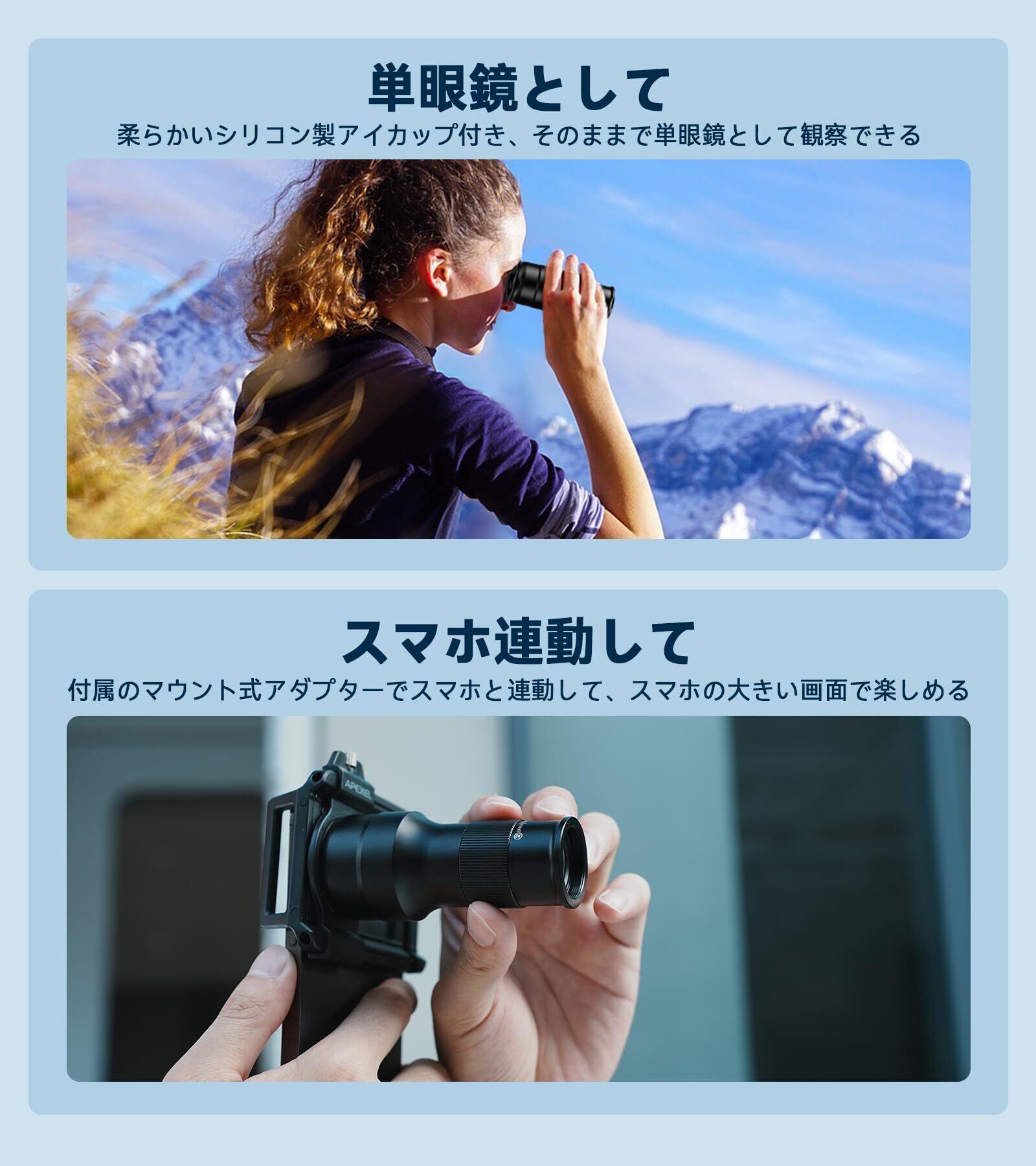 【高品質光学レンズ】革新的9組12枚コーティングされた光学レンズです。高級なBaK4プリズムやFMCマルチコーティングを採用しました。光透過率>98%、被写体歪曲率<6%、光反射率<0.3%、プロなデジタルカメラのように優れたボケ効果があり対象物の美しさをより鮮明になります。