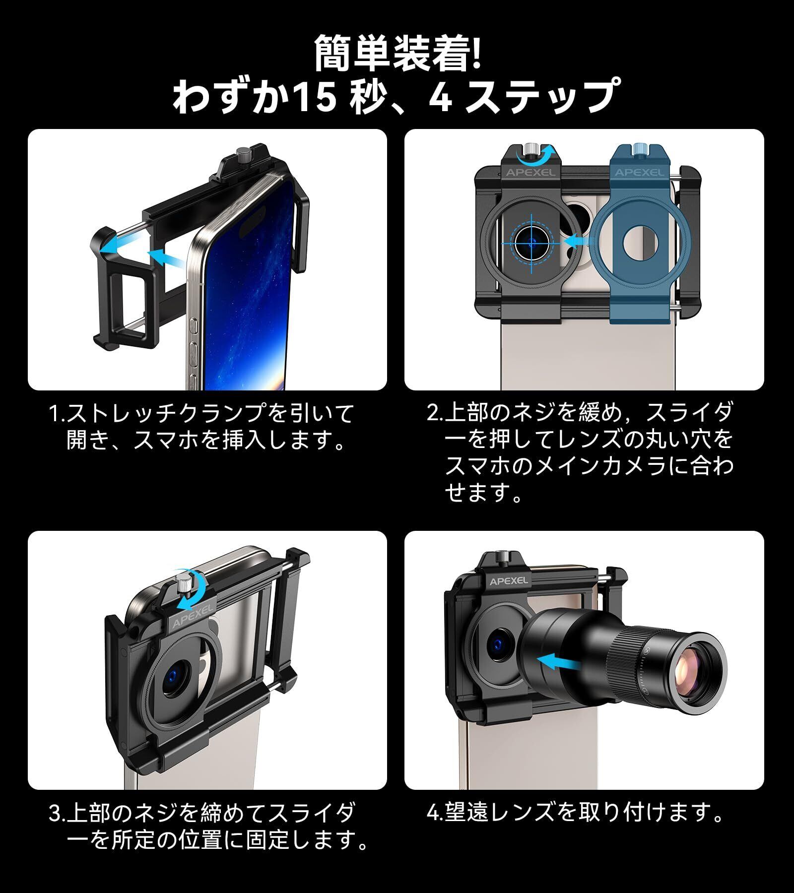 【99%のスマホに対応する】安定性抜群なマウント式アダプター付属しています。主流の99.99%スマホに対応できます。【使用方法簡単】マウントをスマホに装着、接眼をスマホのメインカメラと合わせ、スマホ望遠レンズをマウントに押し込め、インストール完了!対象物に向かってフォーカスリングを回しながら、画面がクリアになり、シャッター!プロ並みな美しい写真が入手します。
