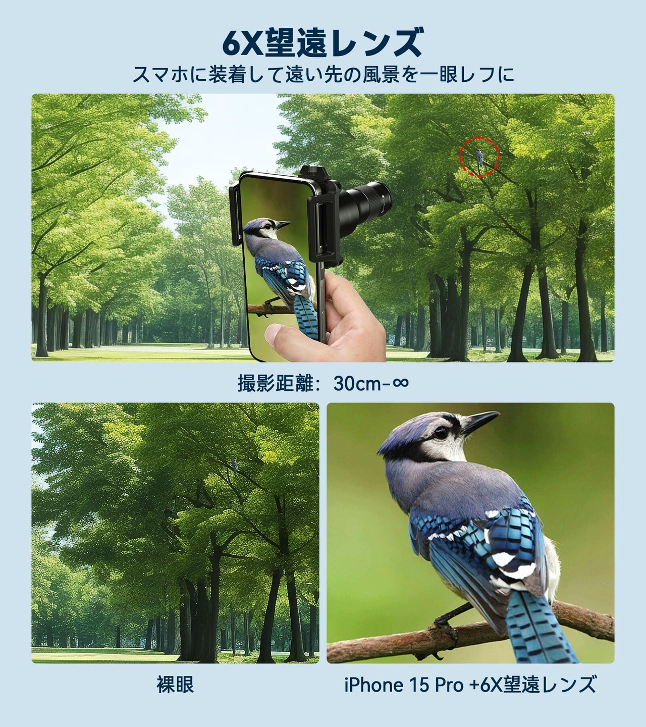 焦点距離の説明 望遠レンズ0.3m至8000m、マクロレンズ15cmから45cm