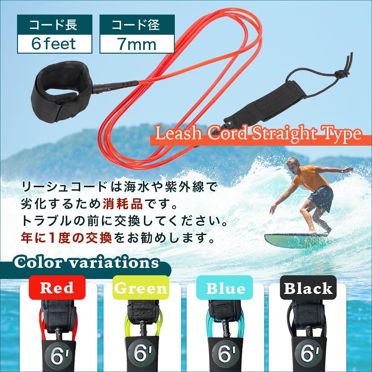 【安全性を高めるサーフィン必須アイテム】 リーシュコードは、サーフィン中の安全を守るための重要な装備です。ボードが波に流されるのを防ぎ、サーファーがすぐにボードに戻れるため、転倒時の危険を軽減します。特に初心者から上級者まで幅広いサーファーに対応しており、急な波でも安心して楽しむことができます。リーシュコードは消耗品のため、予備コードの保有と、年に1度の定期的な交換を推奨します。