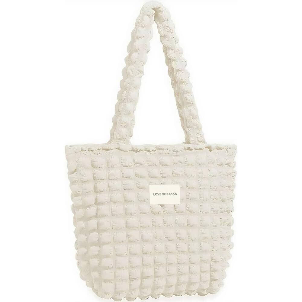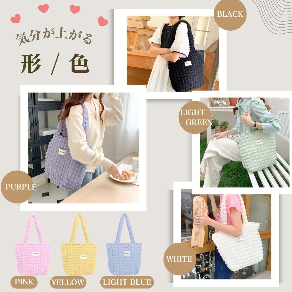 【ポコポコ素材で視線を集める】立体感のあるポップコーン風デザインが、シンプルなコーディネートにアクセントを加え、持つだけでおしゃれ度がアップします。