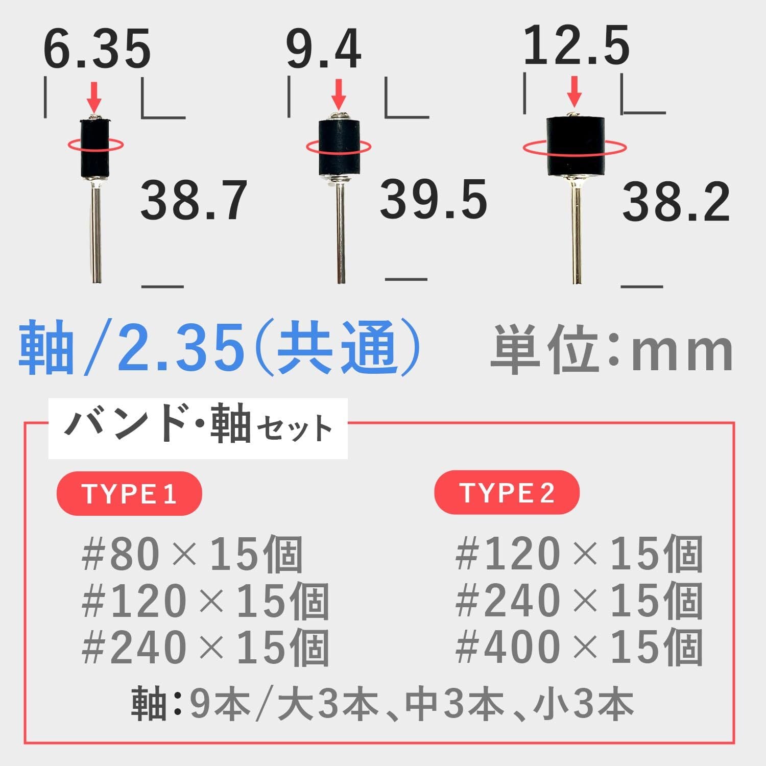 セット内容:ヤスリ番手各15個、シャフト各3本 番手120×15個、番手240×15個、番手400×15個、軸2.35mmシャフト×9本(大3本、中3本、小3本) 番手80×15個、番手120×15個、番手240×15個、軸2.35mmシャフト×9本(大3本、中3本、小3本)