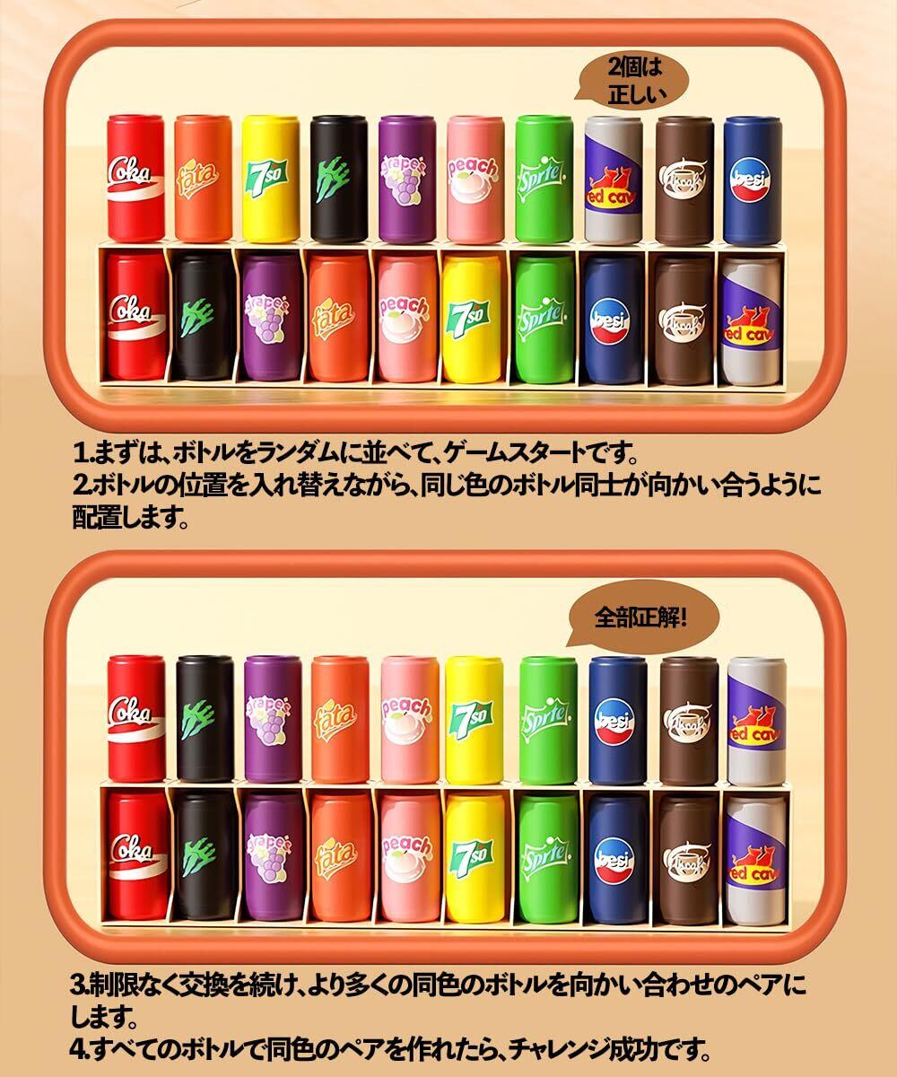 【遊ぶだけで知育に】ボトル入れ替えに従い、ペア数が変動する(増えるか減るか)。闇雲にボトルを入れ替えるだけでは正解を導き出すのはほぼ不可能。どれを入れ替わったか、ペア数はどのように変化したかを常に頭の中で整理し分析する必要があり、記憶力や推理力が正解を突き止めるポイントとなります。